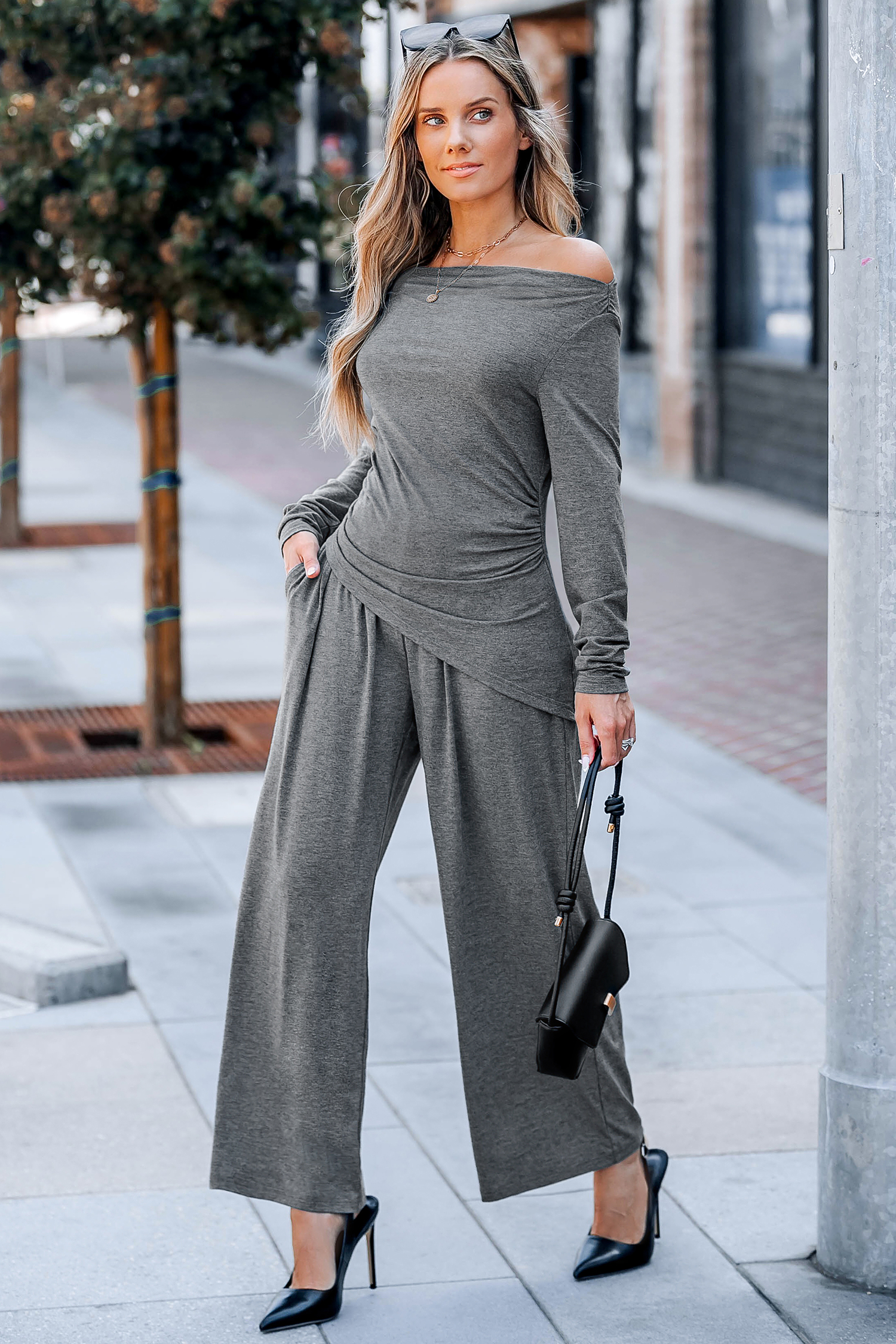 Graues Set aus Off-Shoulder-Top und Wide Leg Hose