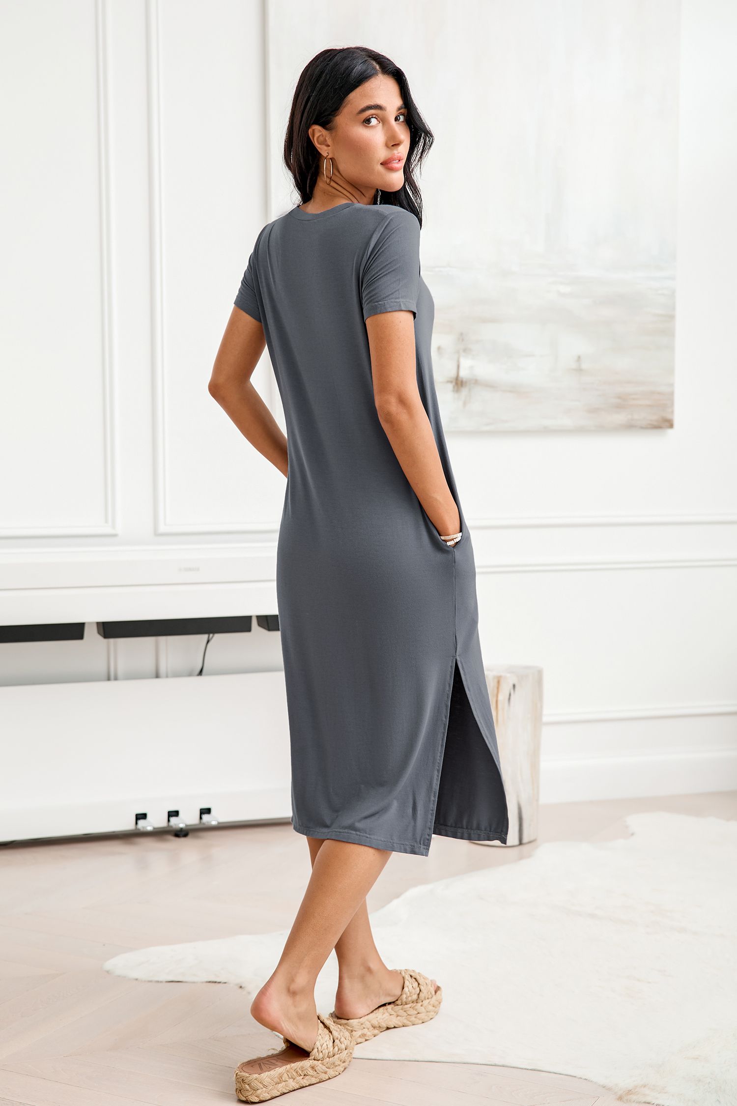 Graues kurzärmeliges Midi-Jerseykleid mit V-Ausschnitt