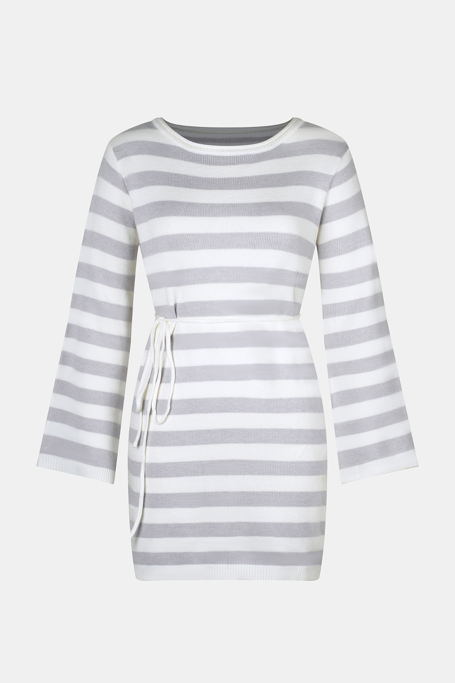 Grau-weiß gestreiftes Mini-Strickkleid mit Glockenärmeln