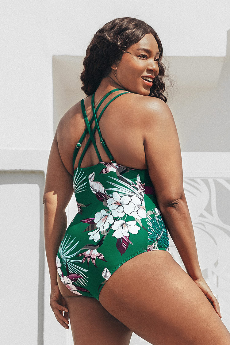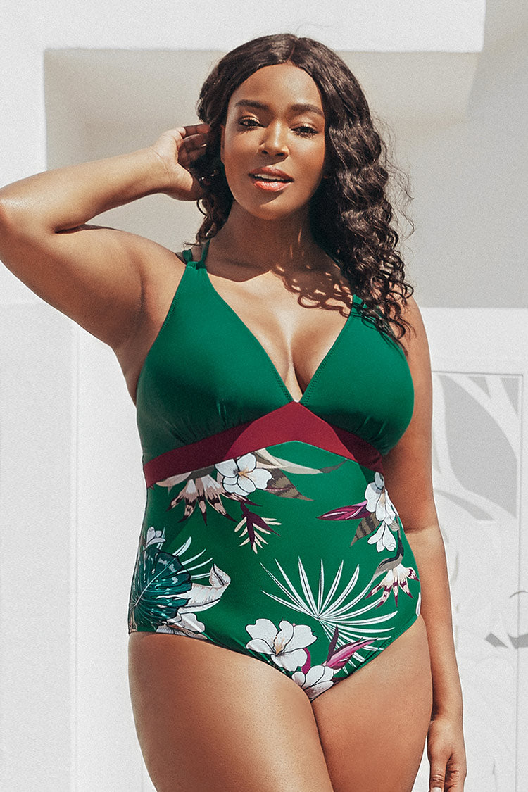 Große Größen Badeanzug mit Floral-Muster in Grün