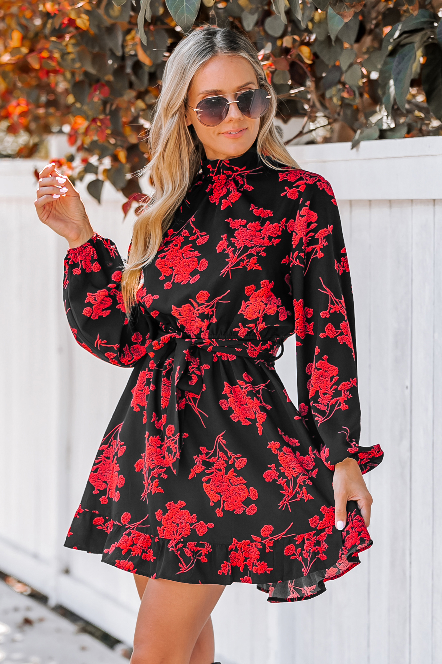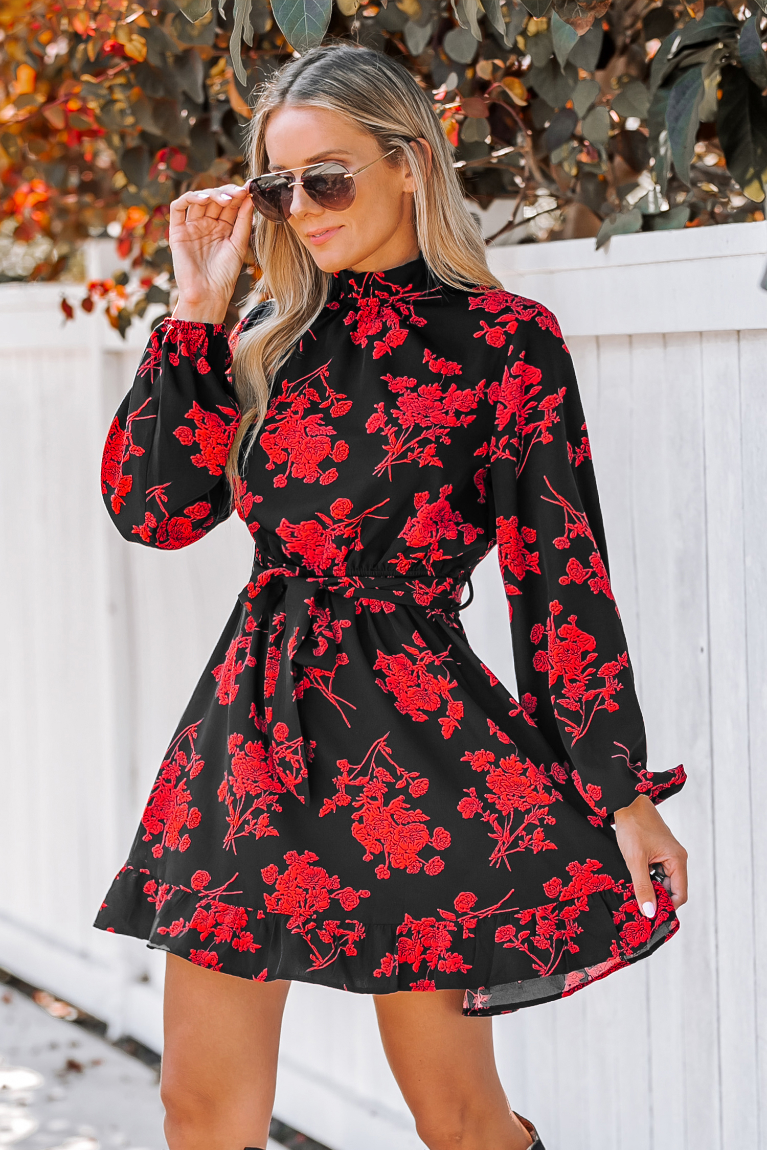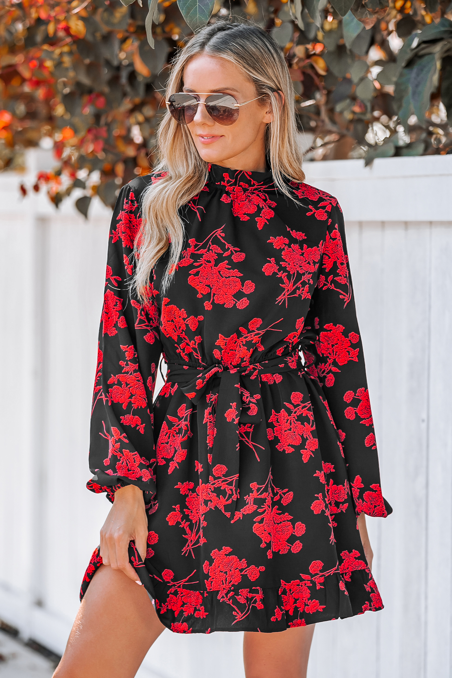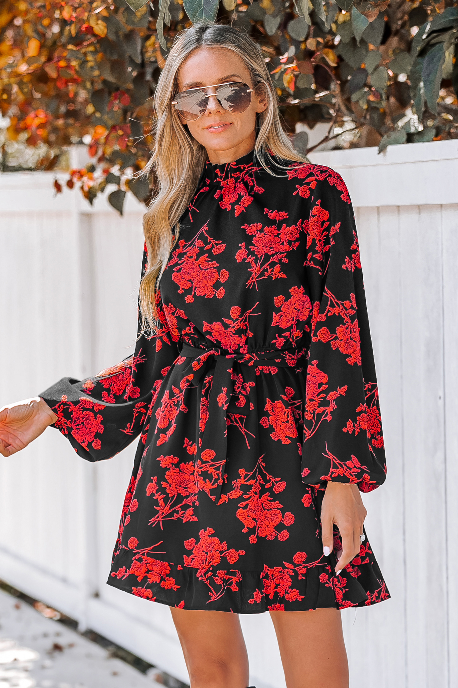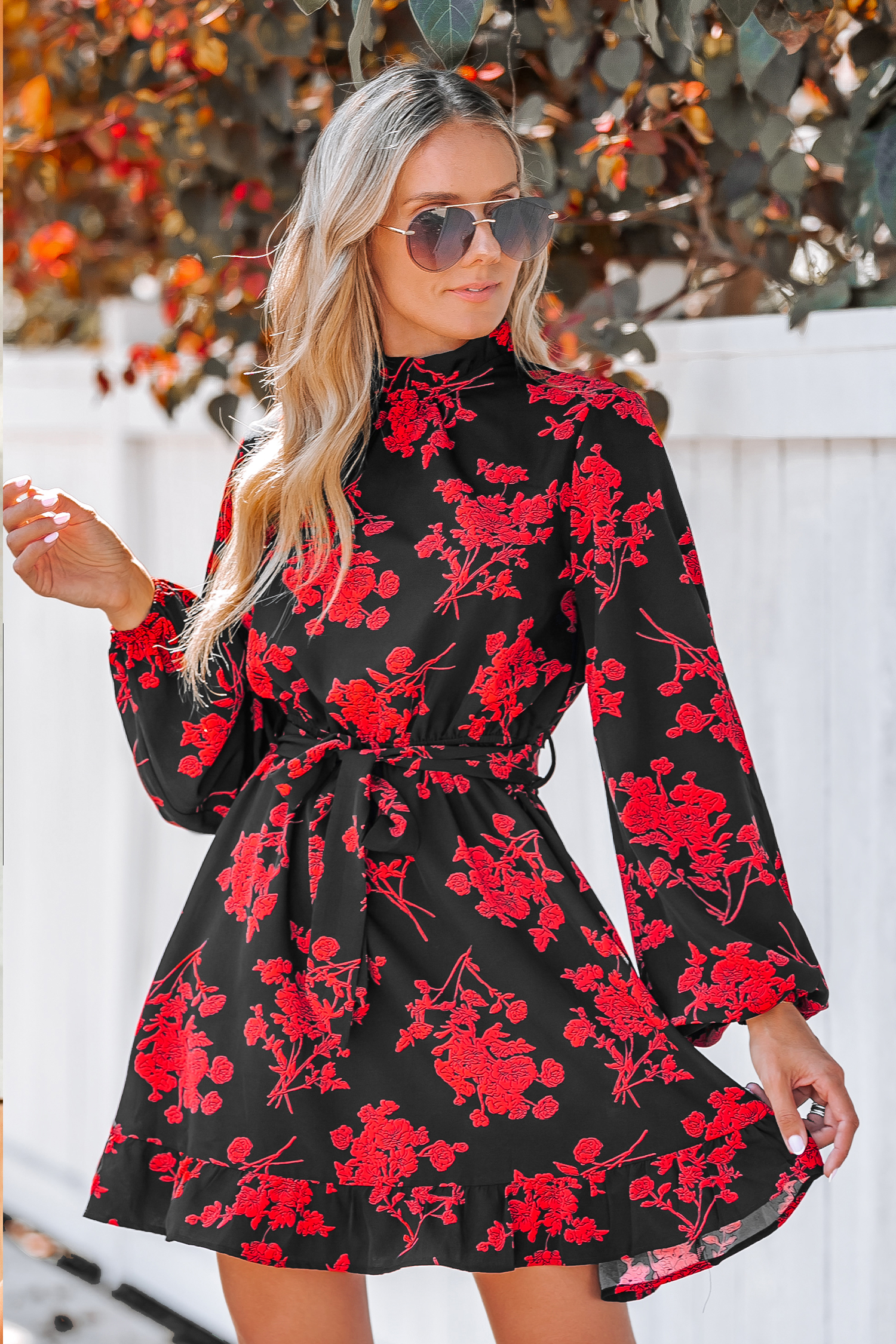 Gürtel-Minikleid mit Blumenmuster und Rundhalsausschnitt