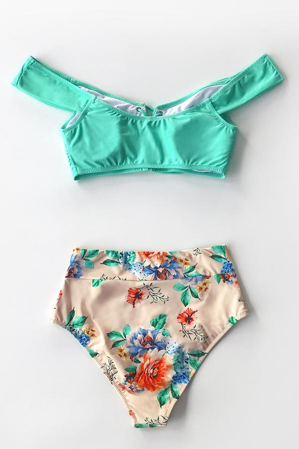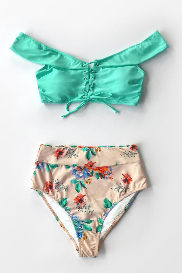 Grüner und floraler Bikini mit hoher Taille und Schnürung