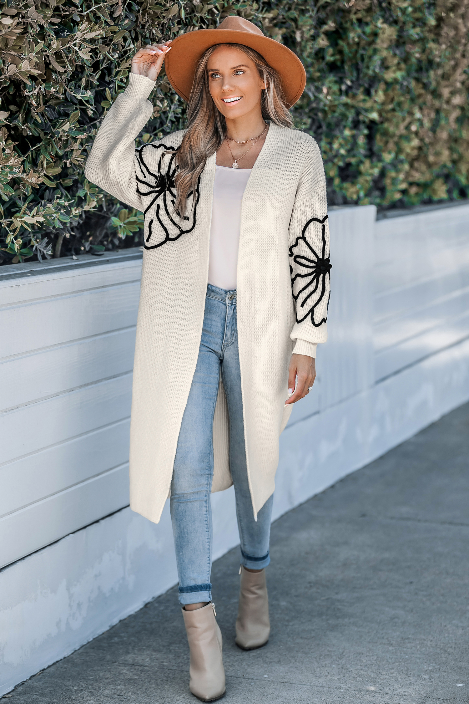 Der elfenbeinfarbene Langarm-Staubwedel bringt Einfachheit mit einer auffälligen schwarzen Blume an Schulter und Ärmel auf den Punkt. Es ist die Art von mühelosem Stil, der alle Blicke auf sich zieht, ohne sich zu sehr anzustrengen.