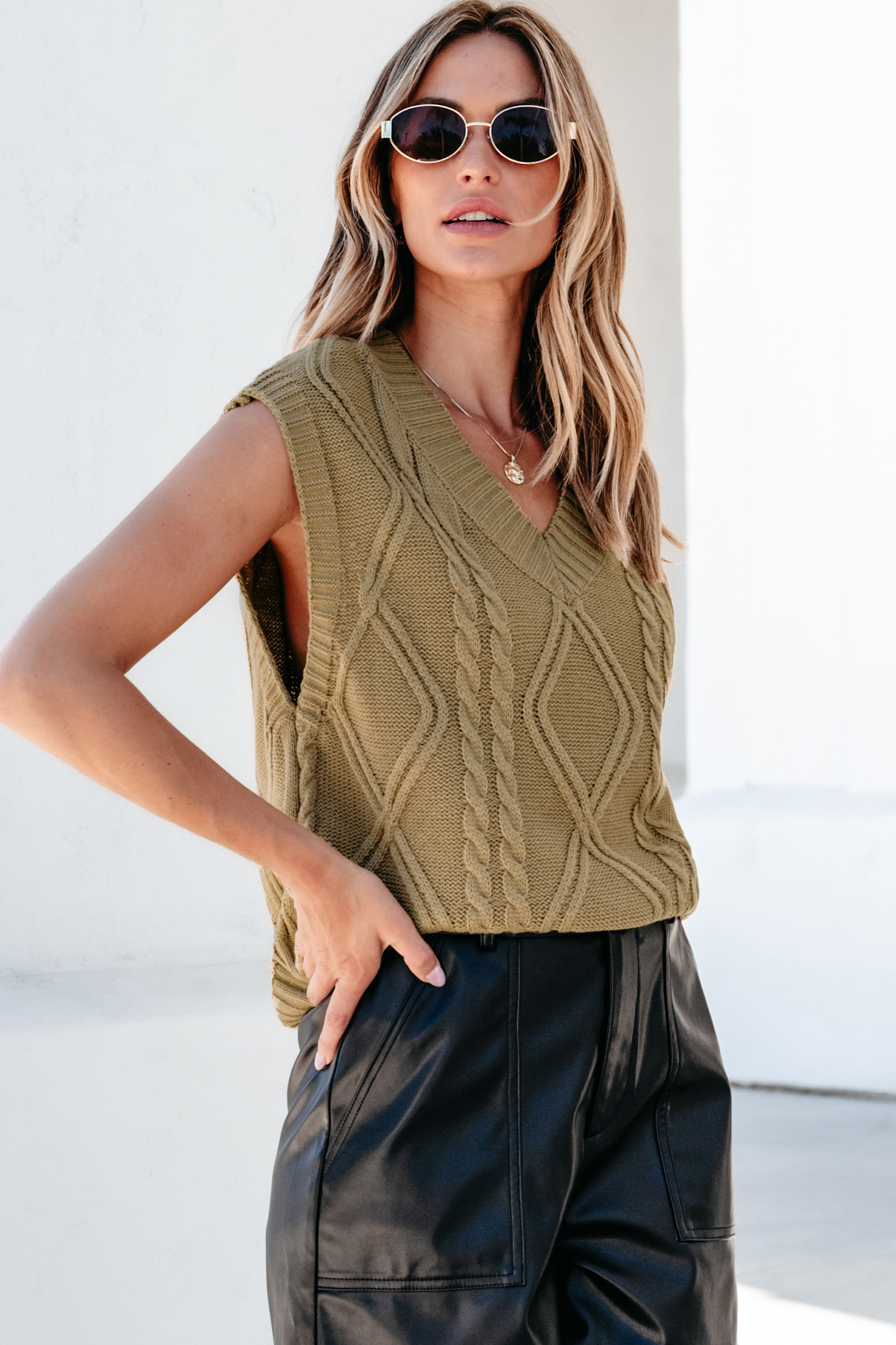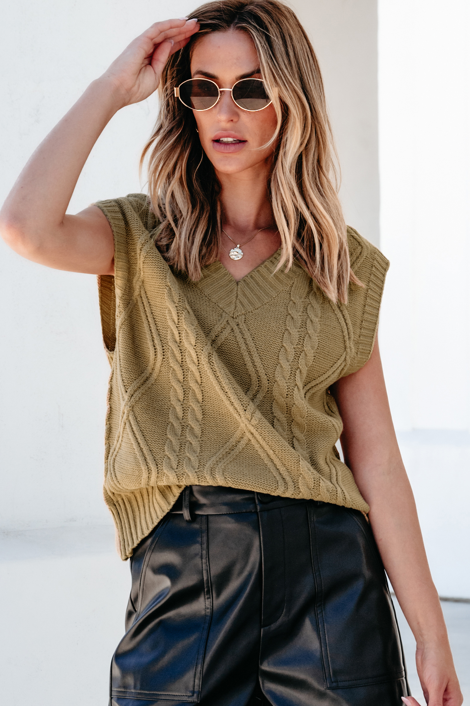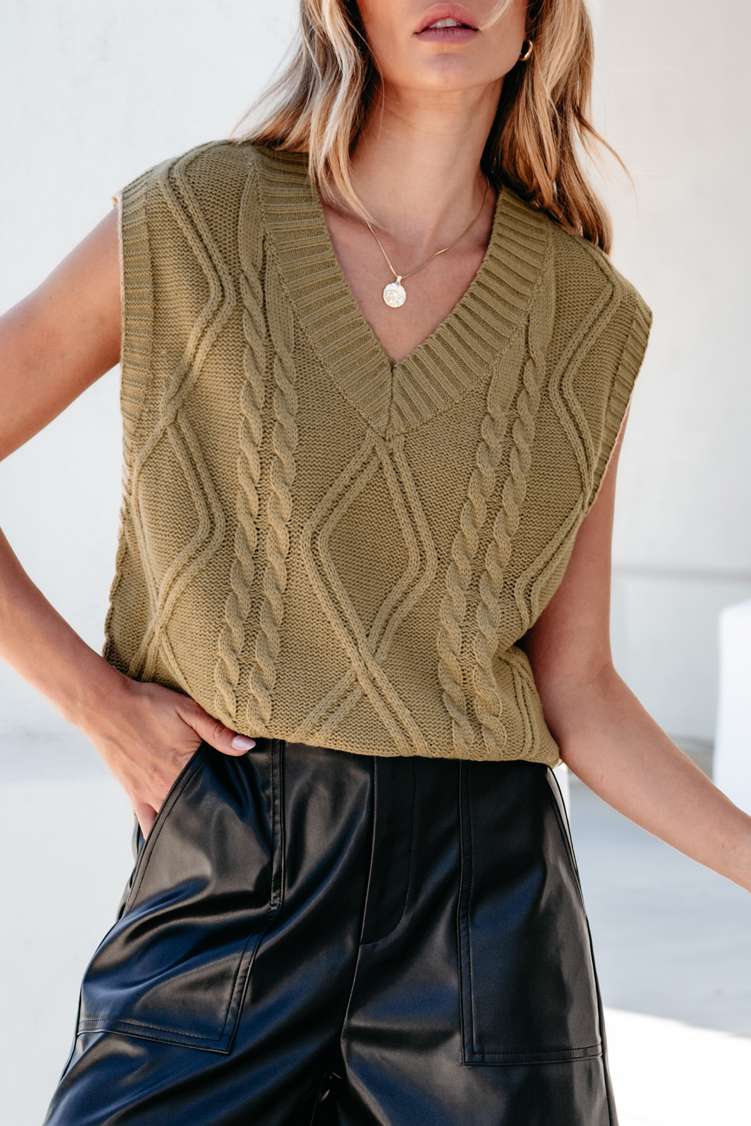 Khakifarbene V-Ausschnitt-Strickweste aus Kabelstrick