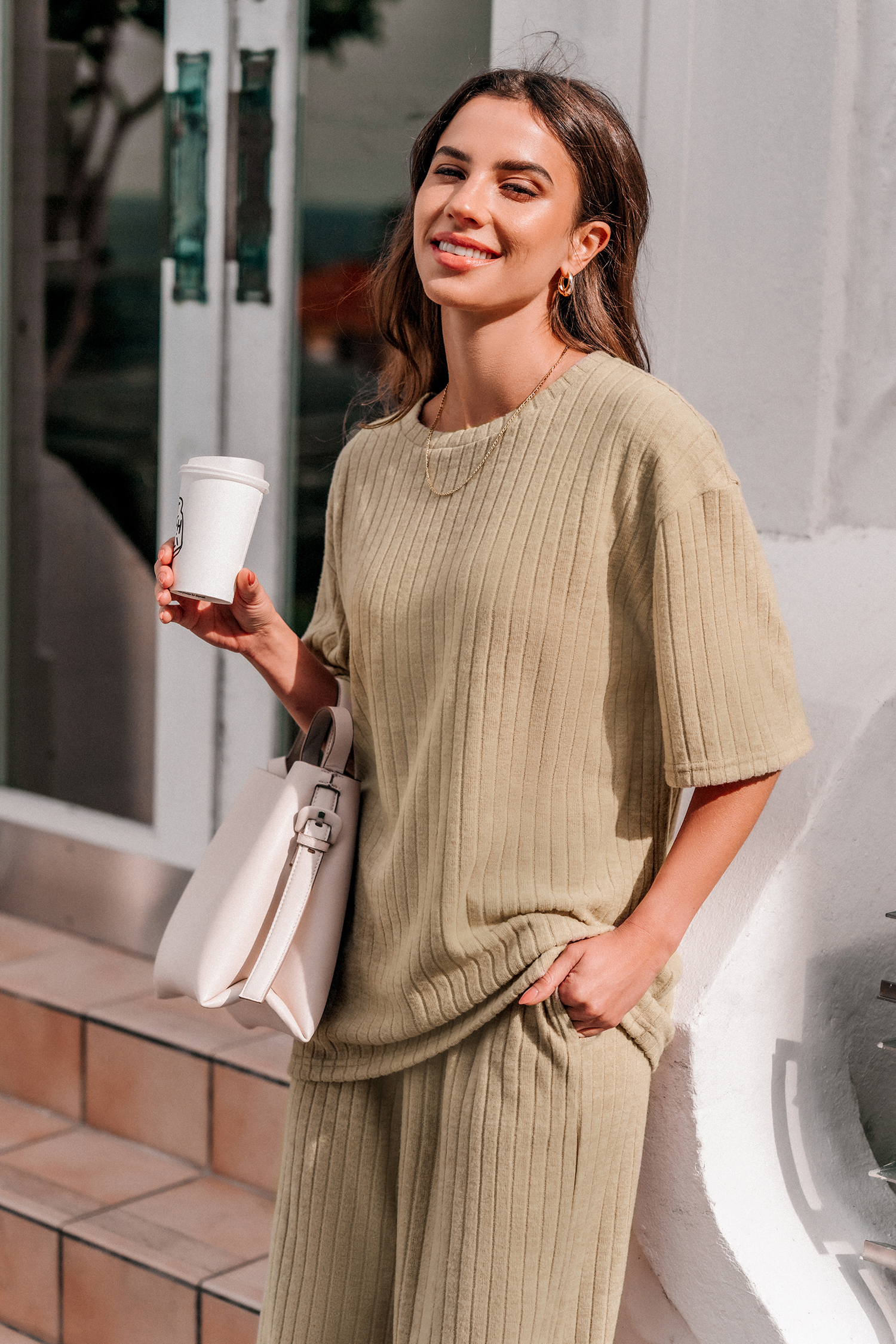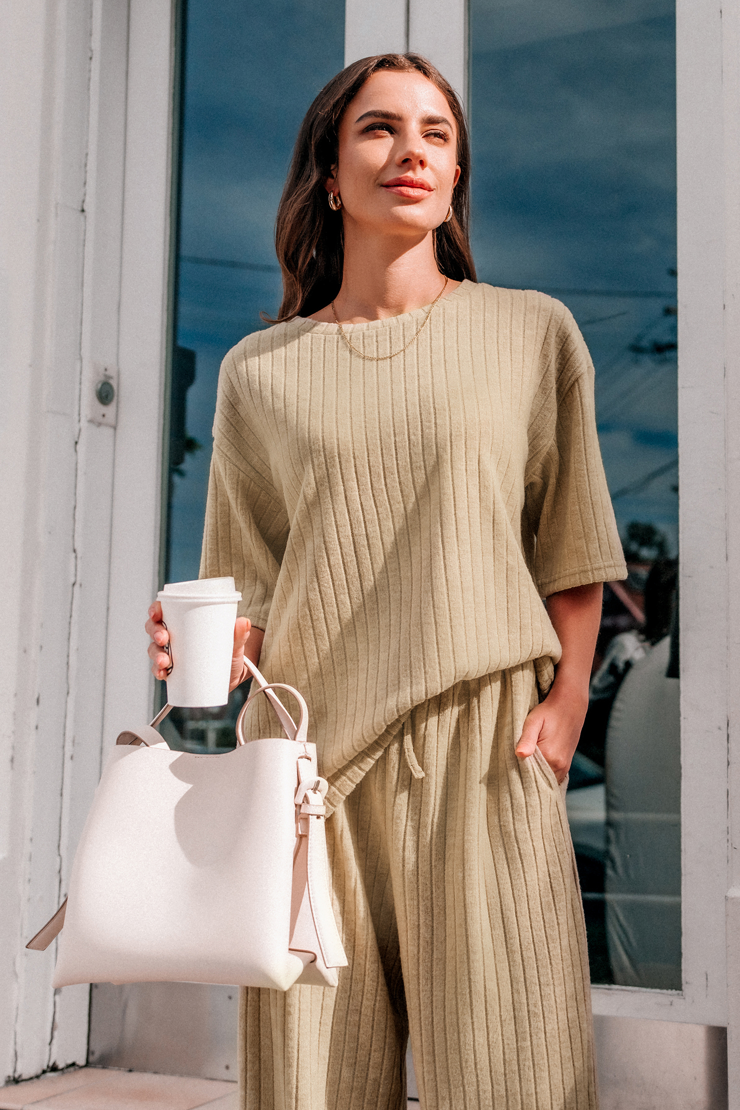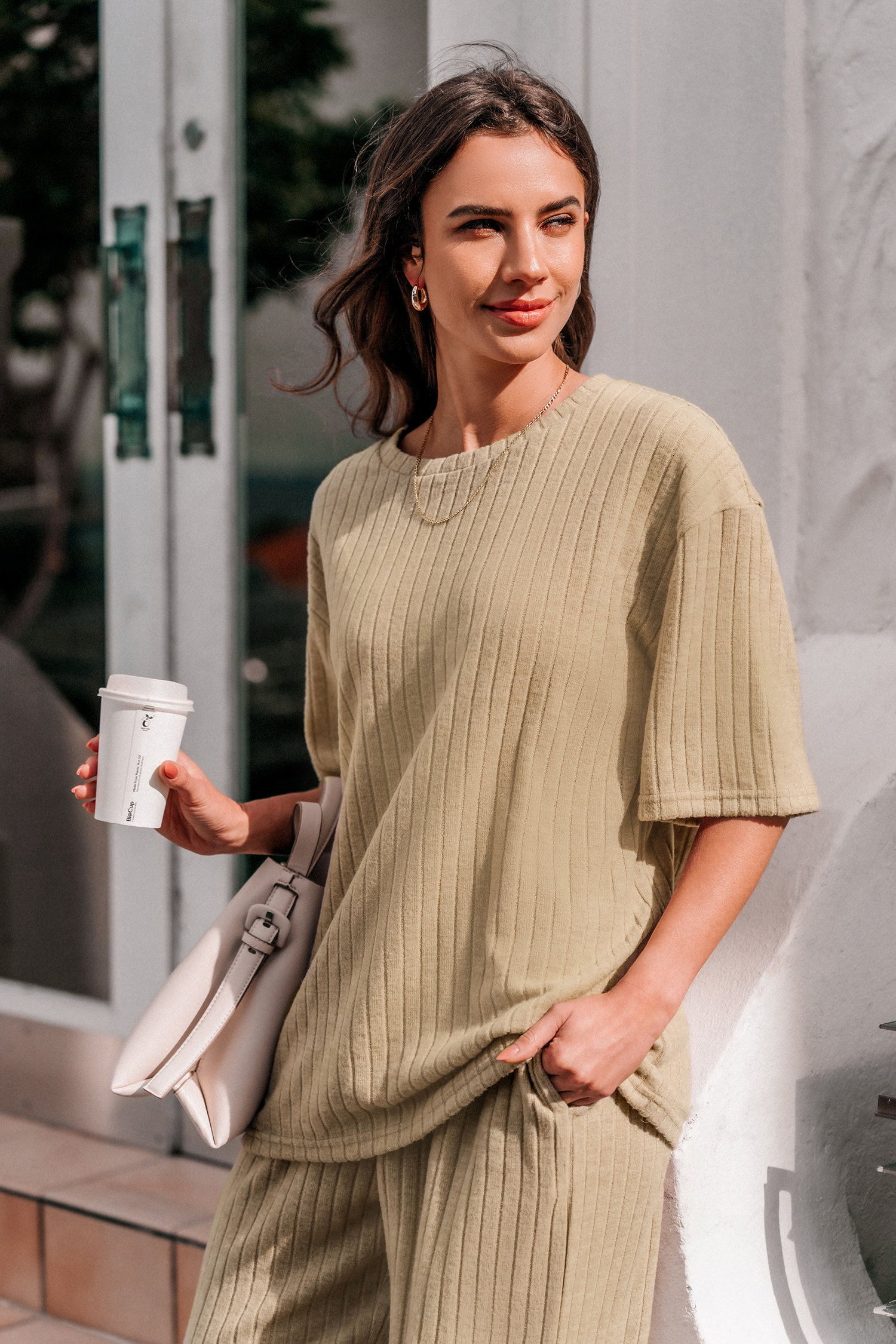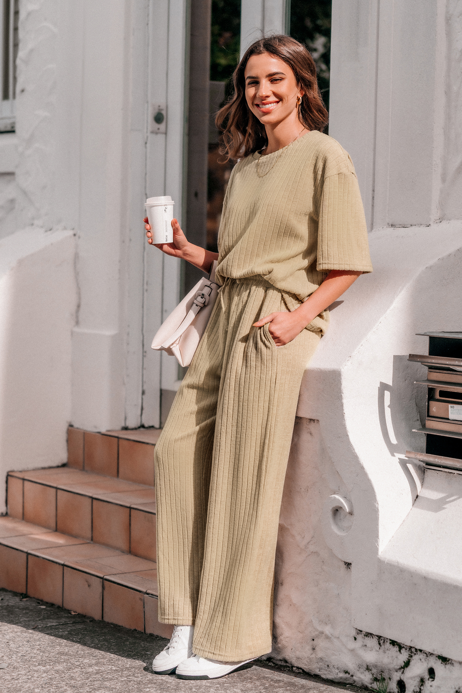 Khaki Set aus geripptem Strick-T-Shirt und Hose mit weitem Bein
