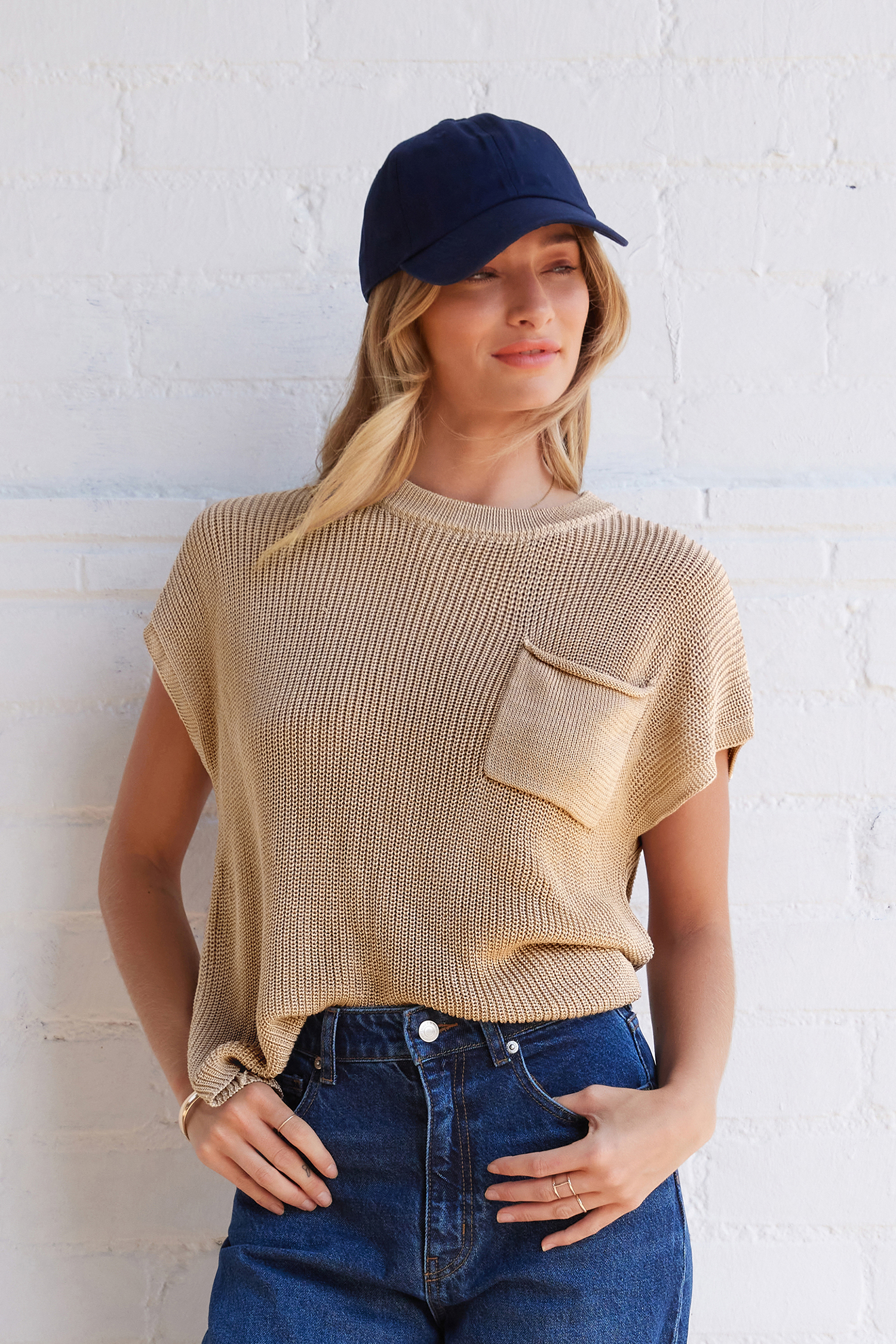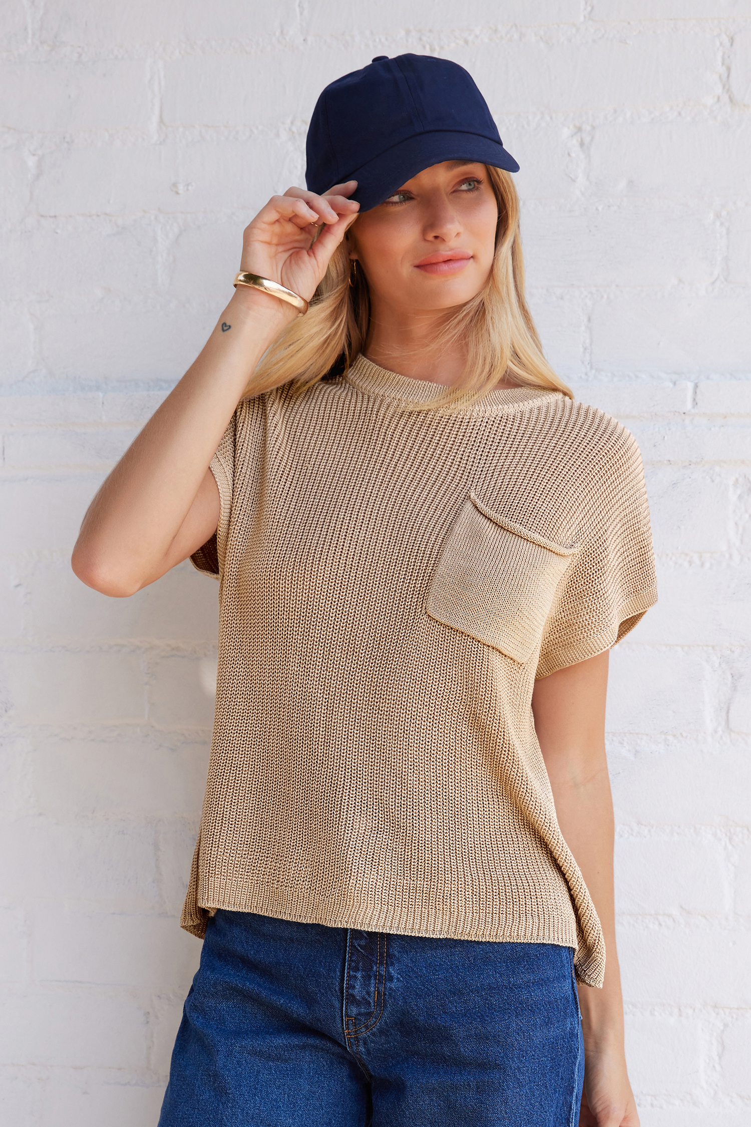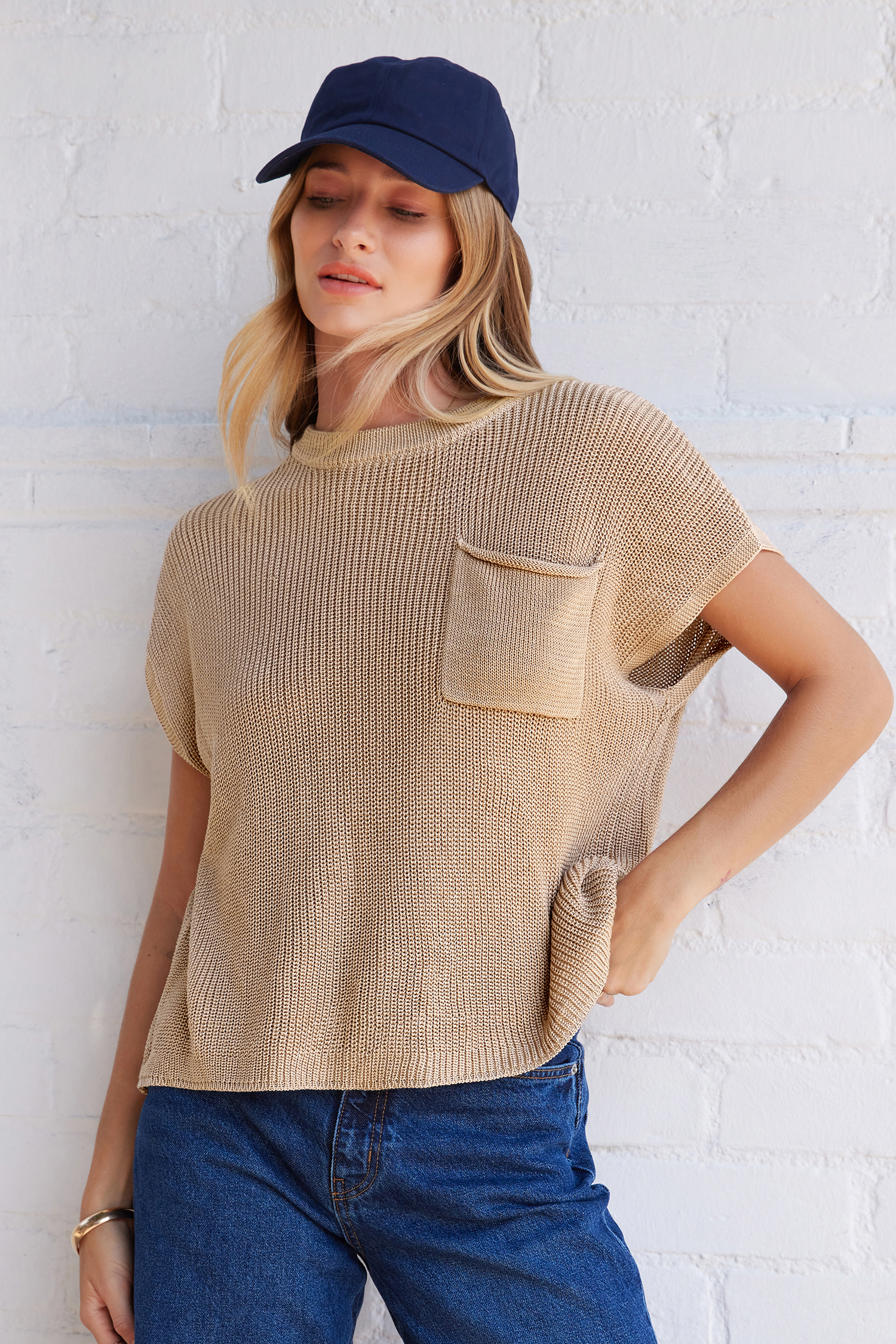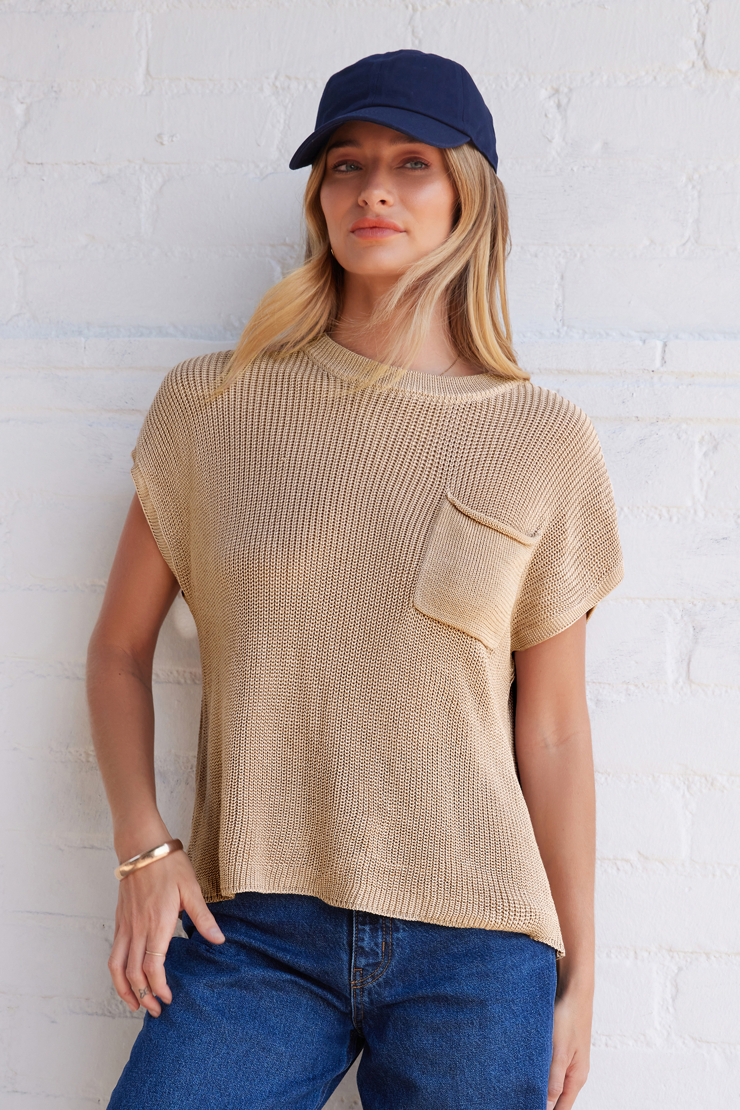 Khakifarbenes kurzärmeliges Strickoberteil mit Rundhalsausschnitt