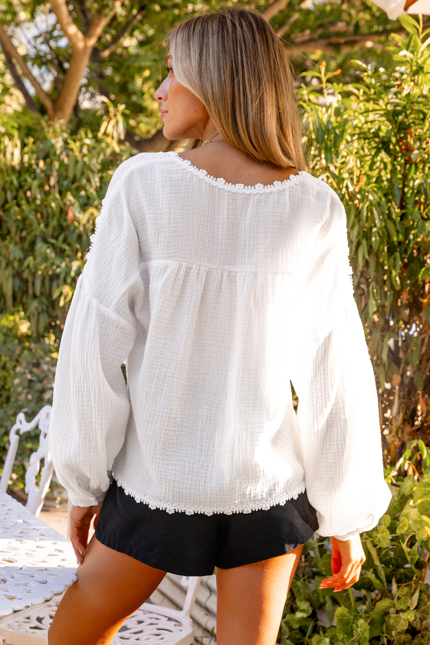 Baumwoll-Top mit Puffärmeln und kontrastfarbener Spitze