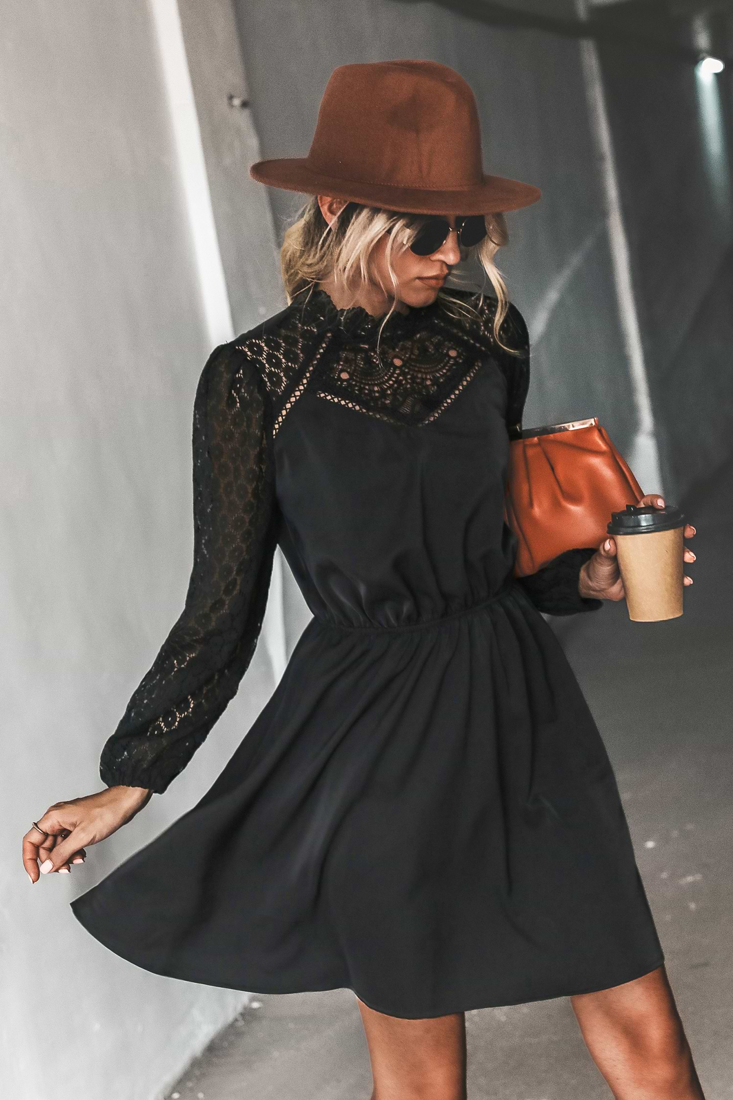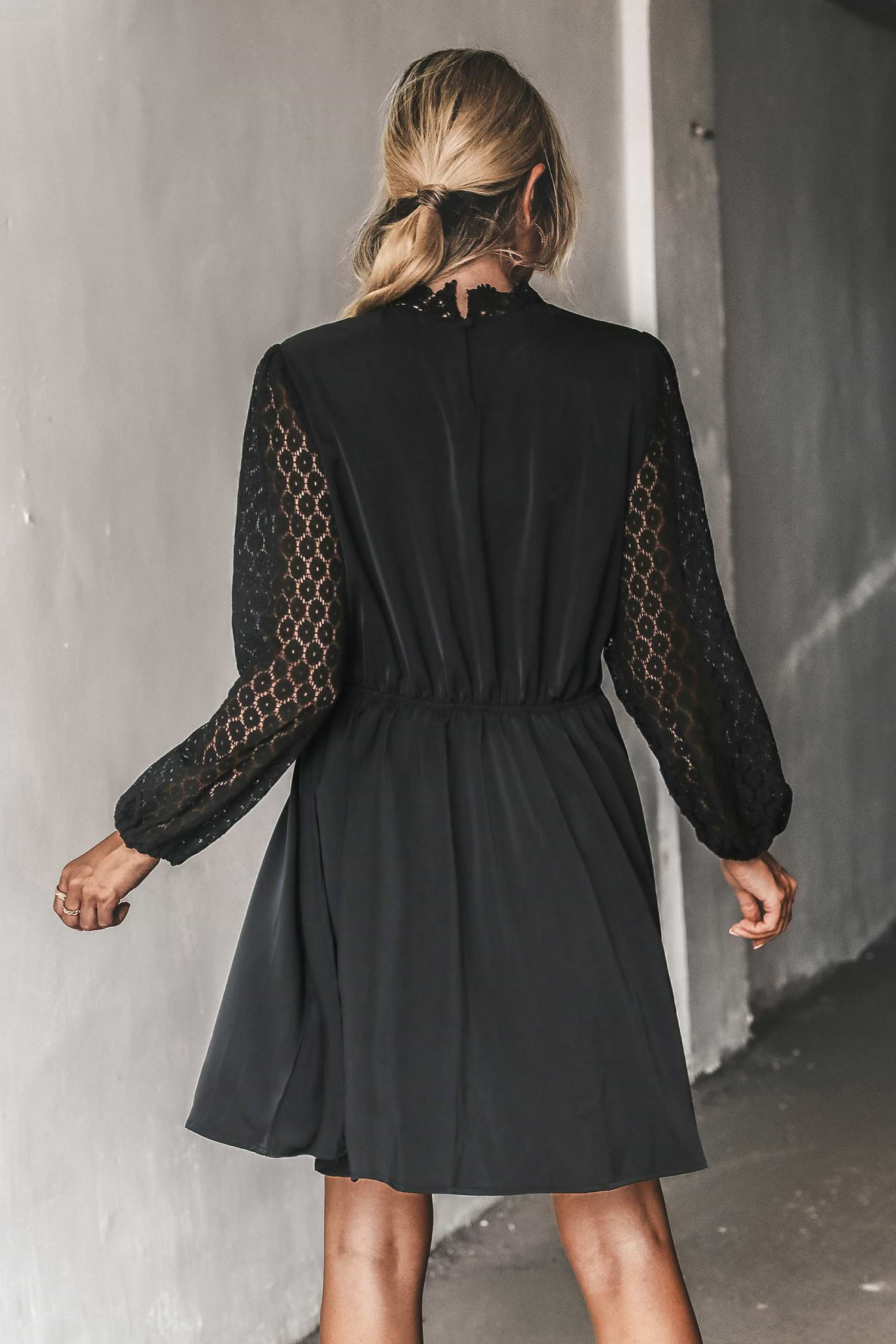 Langärmliges Schwarzes Minikleid mit Spitzenbesatz