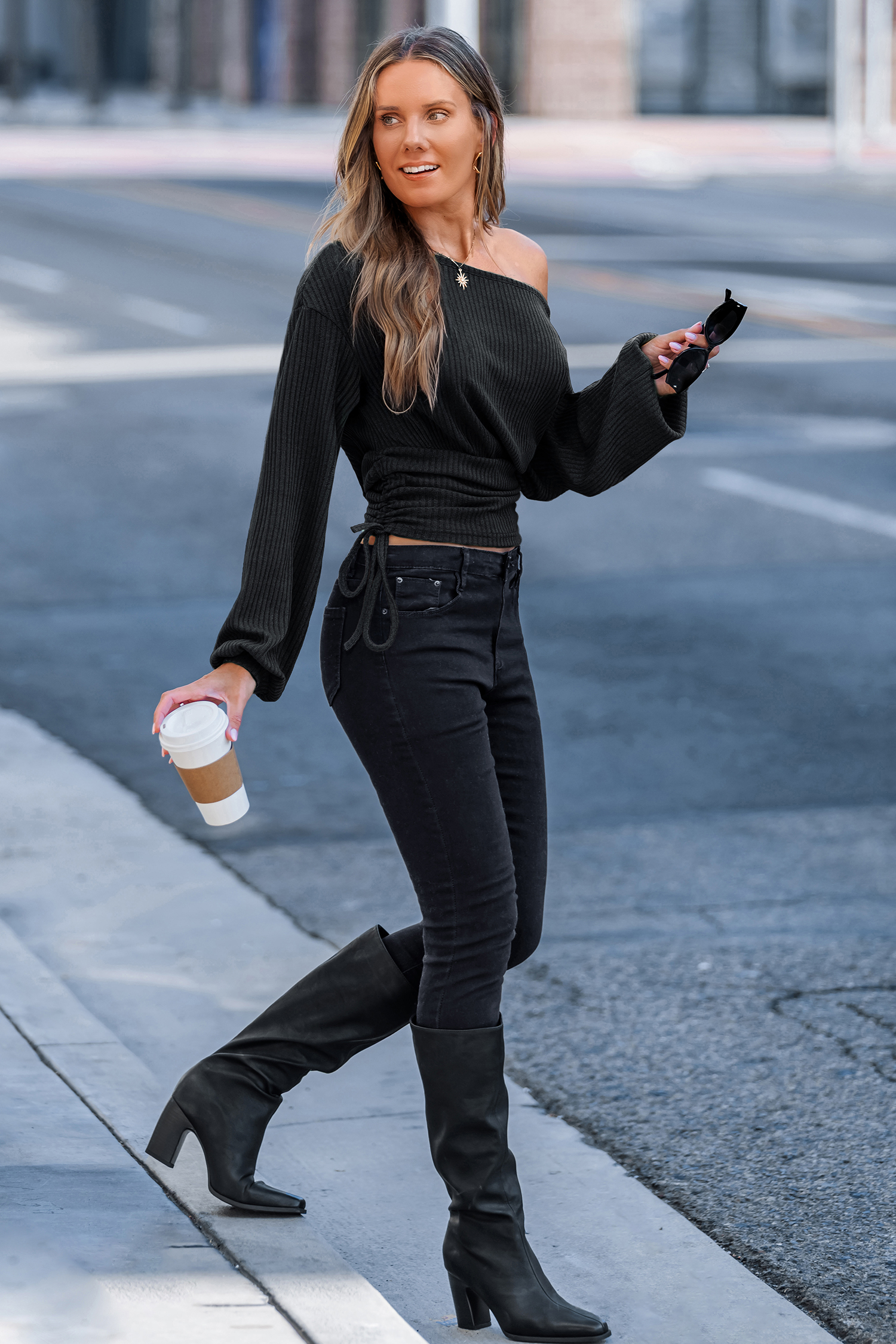 Das schwarze Top ist verspielt, feminin und mühelos charmant! Sein asymmetrischer Ausschnitt, die langen Ärmel und die geknoteten Details machen es zu einer tollen Wahl für Looks, die vom Tag bis in die Nacht reichen.