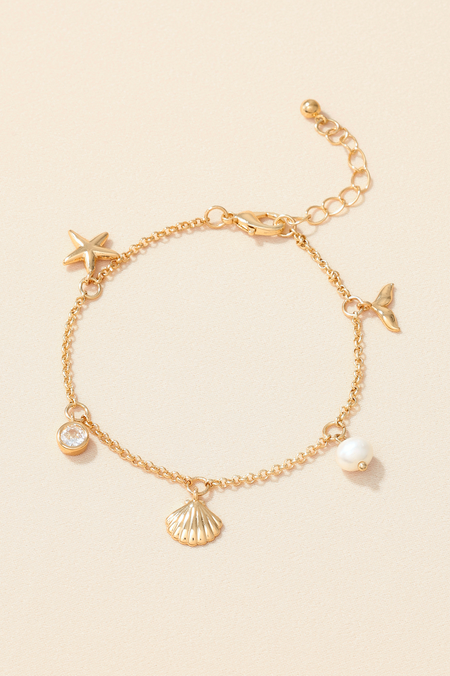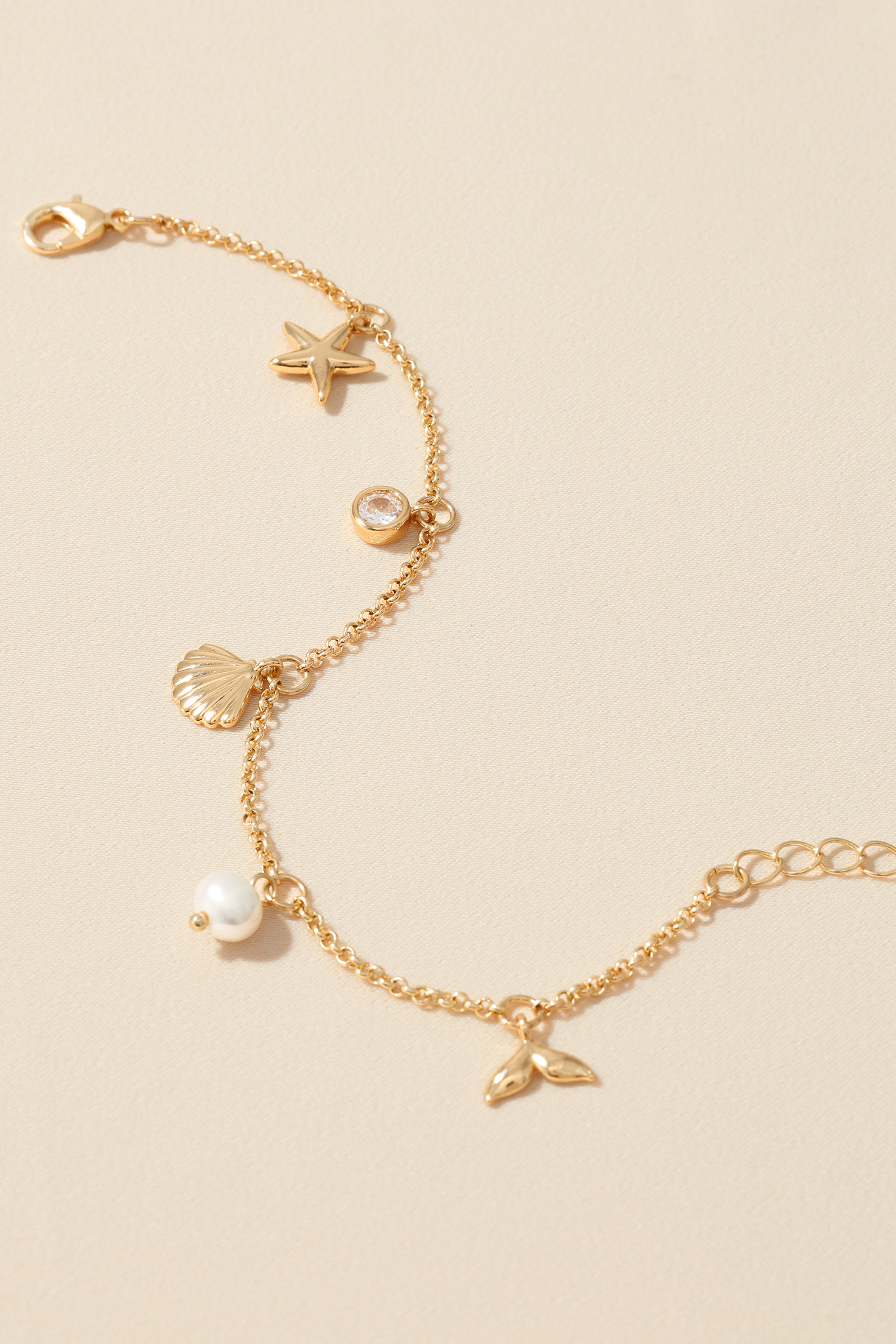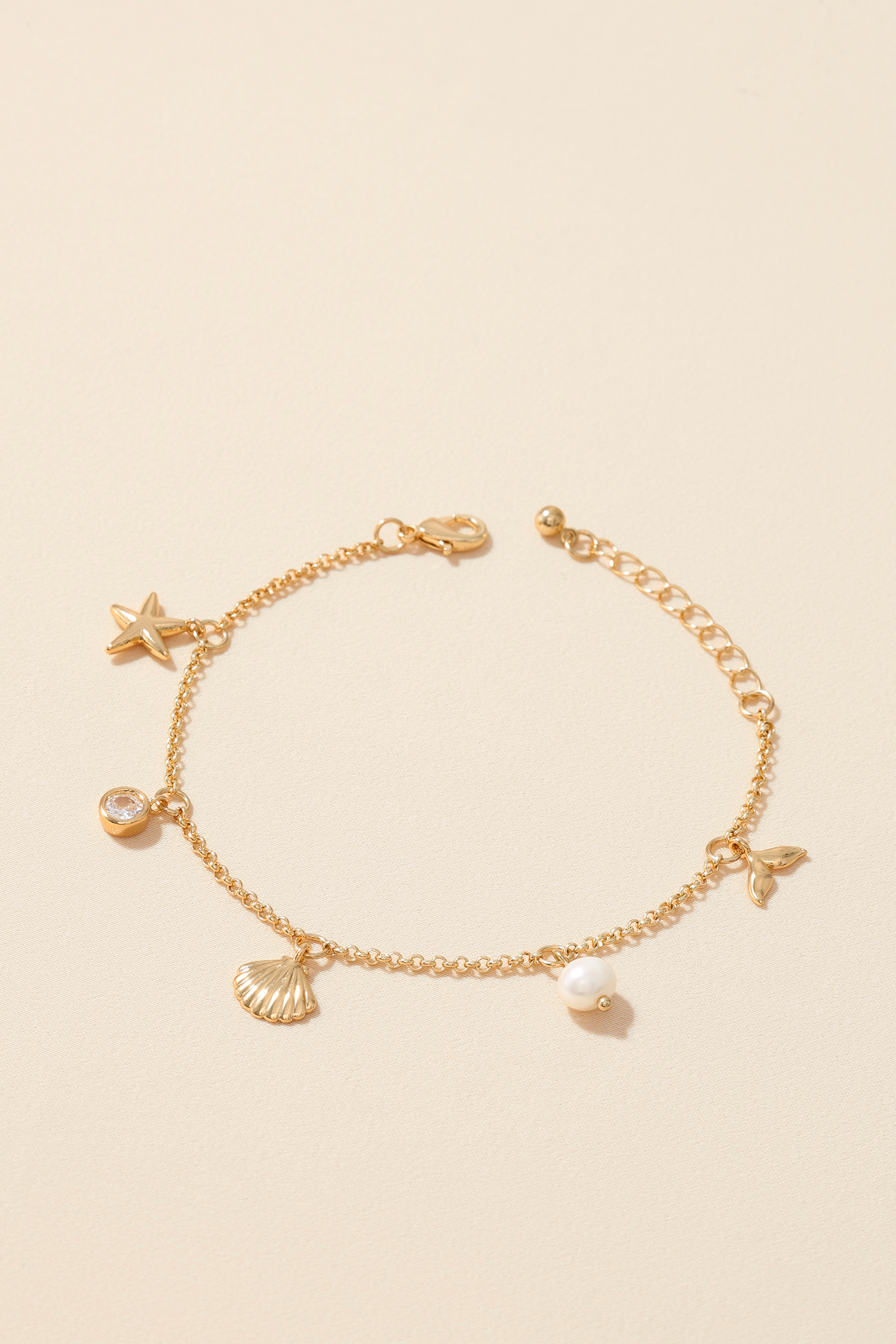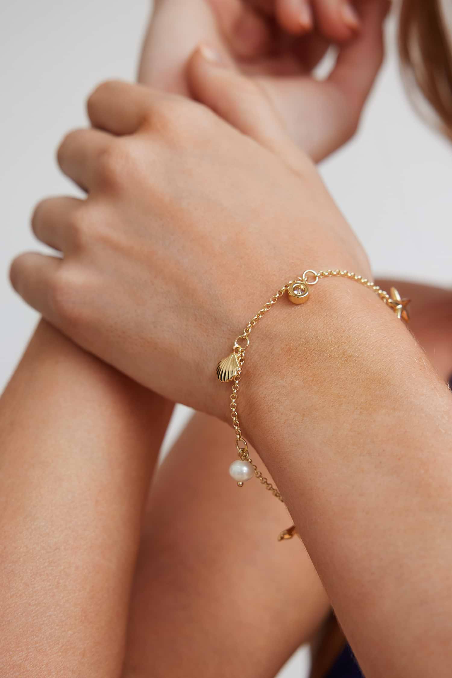 Das goldfarbene Armband verleiht jedem Look einen verspielten, femininen Charme! Eine verstellbare Kette mit Anhängern im Meeresdesign, eine Kunstperle und ein Kunststein sorgen für ein vielseitiges, verspieltes Finish.