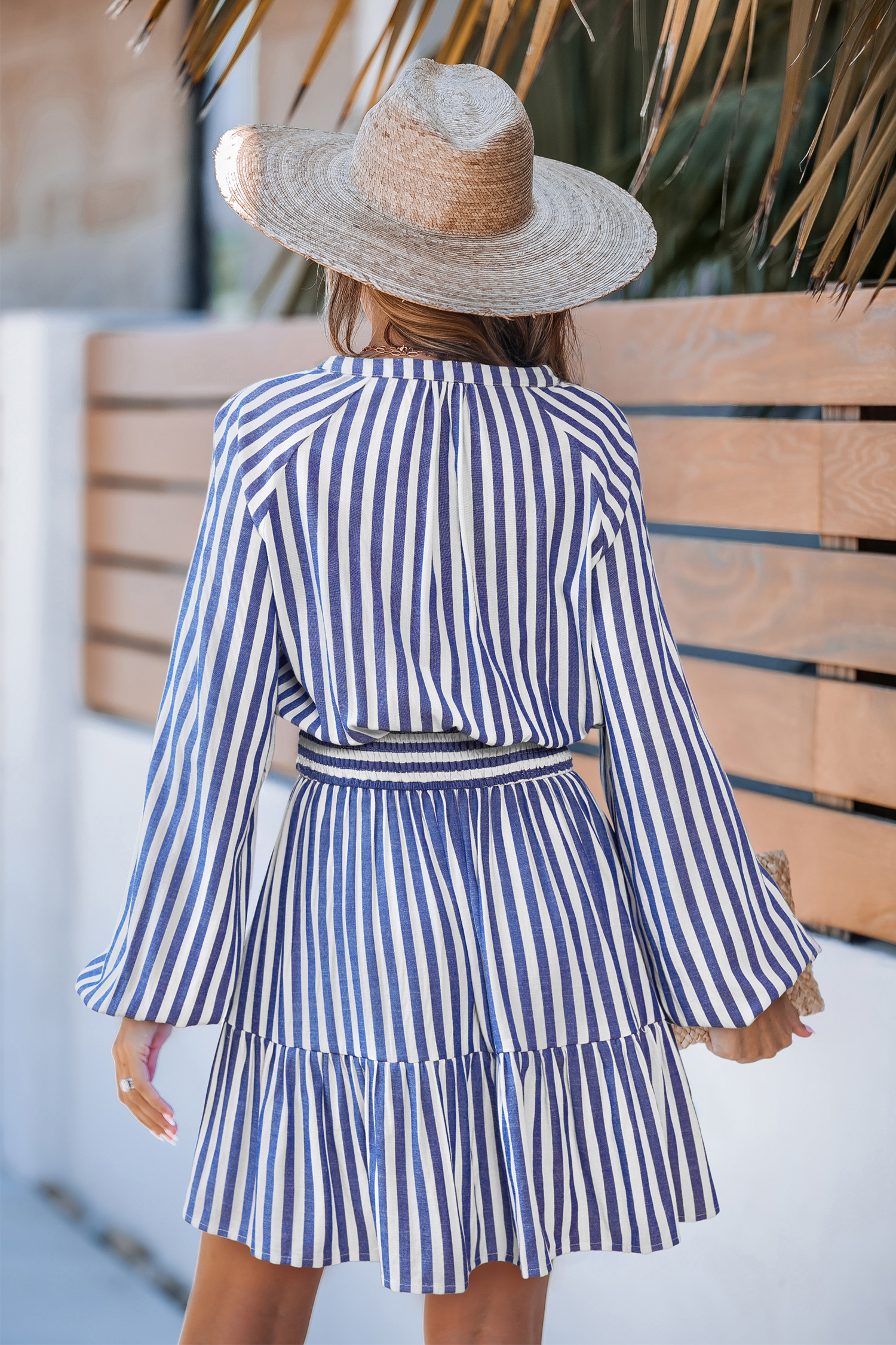 Das Minikleid verleiht sonnigen Tagen luftige, verspielte Energie! Kerbausschnitt und lange Ärmel harmonieren mit einer gesmokten Taille, während die Minilänge dem Look einen verspielten und lässigen Touch verleiht.