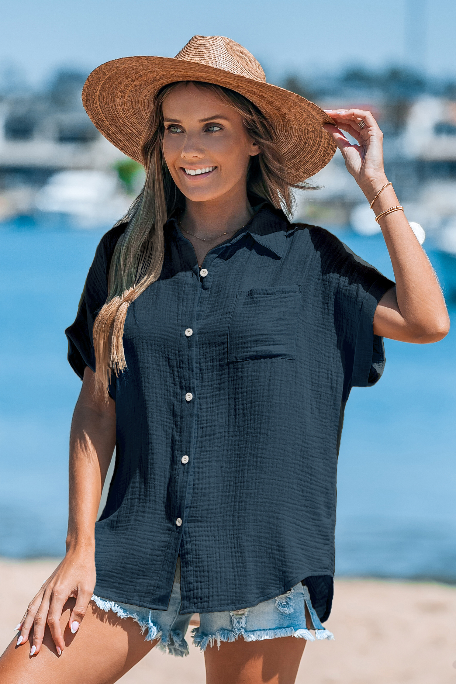 Marineblaues Baumwoll-Top mit Kragen und Knopfleiste