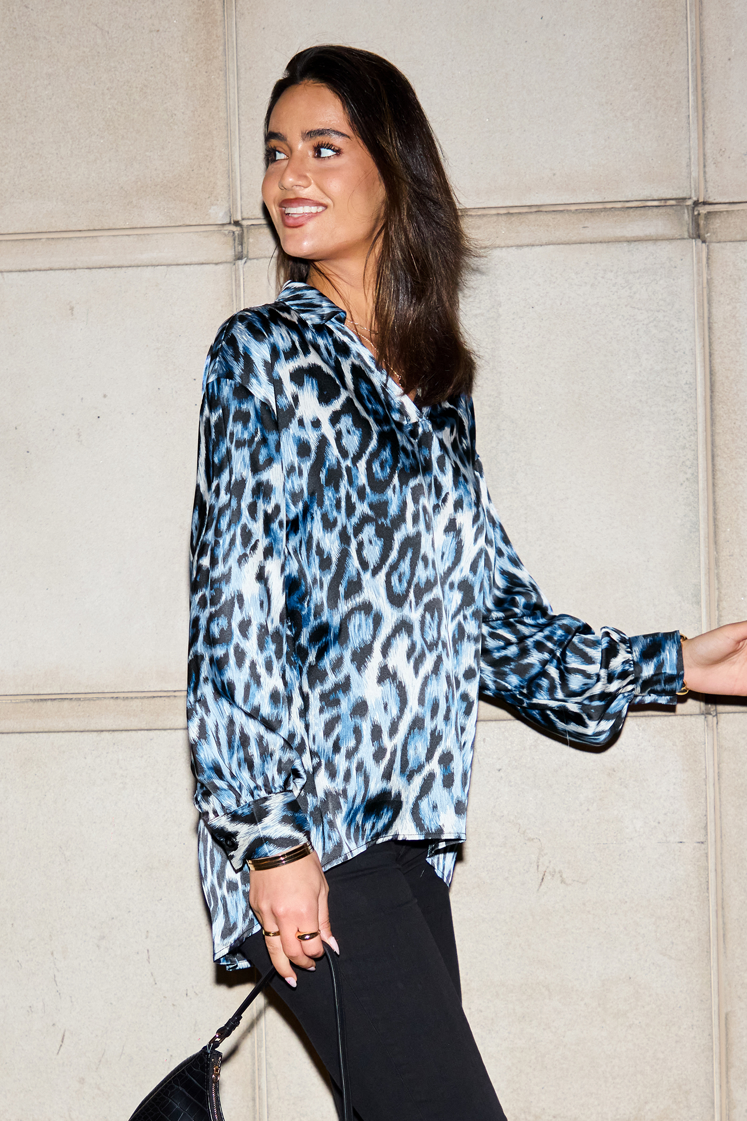 Langärmelige Bluse mit Kragen und Leopardenmuster in Navy