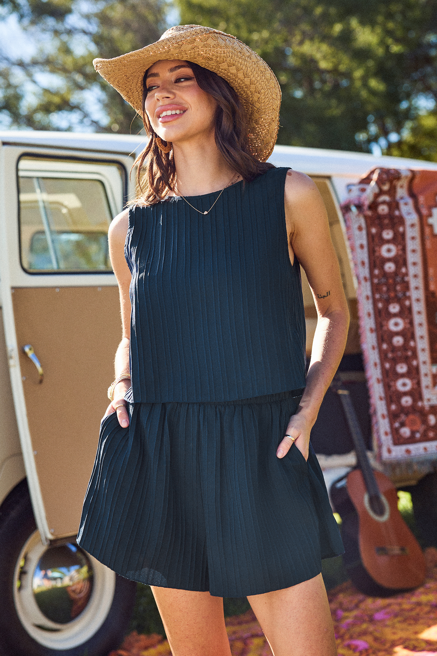 Marineblaues ärmelloses Oberteil & Shorts mit ausgestelltem Bein
