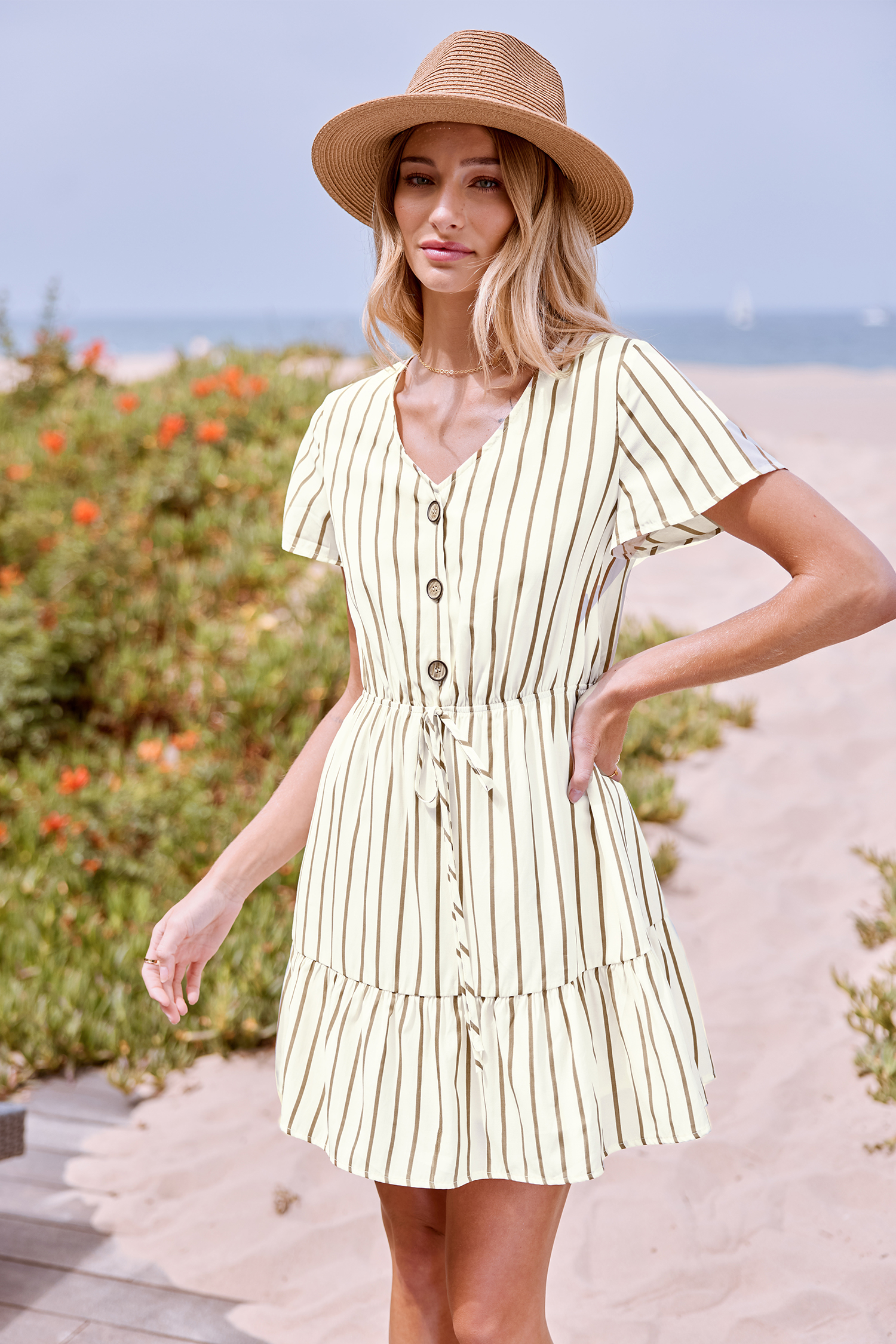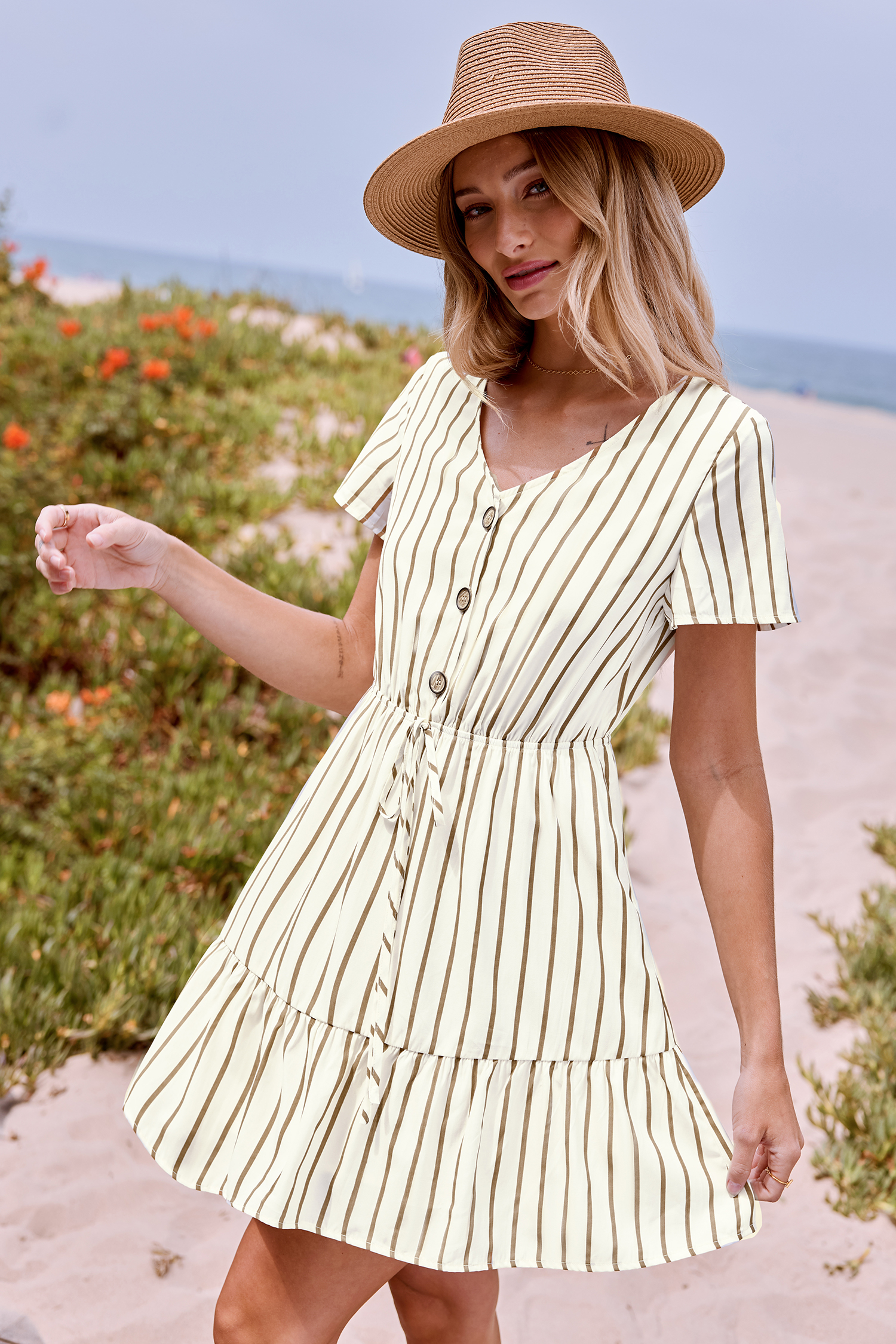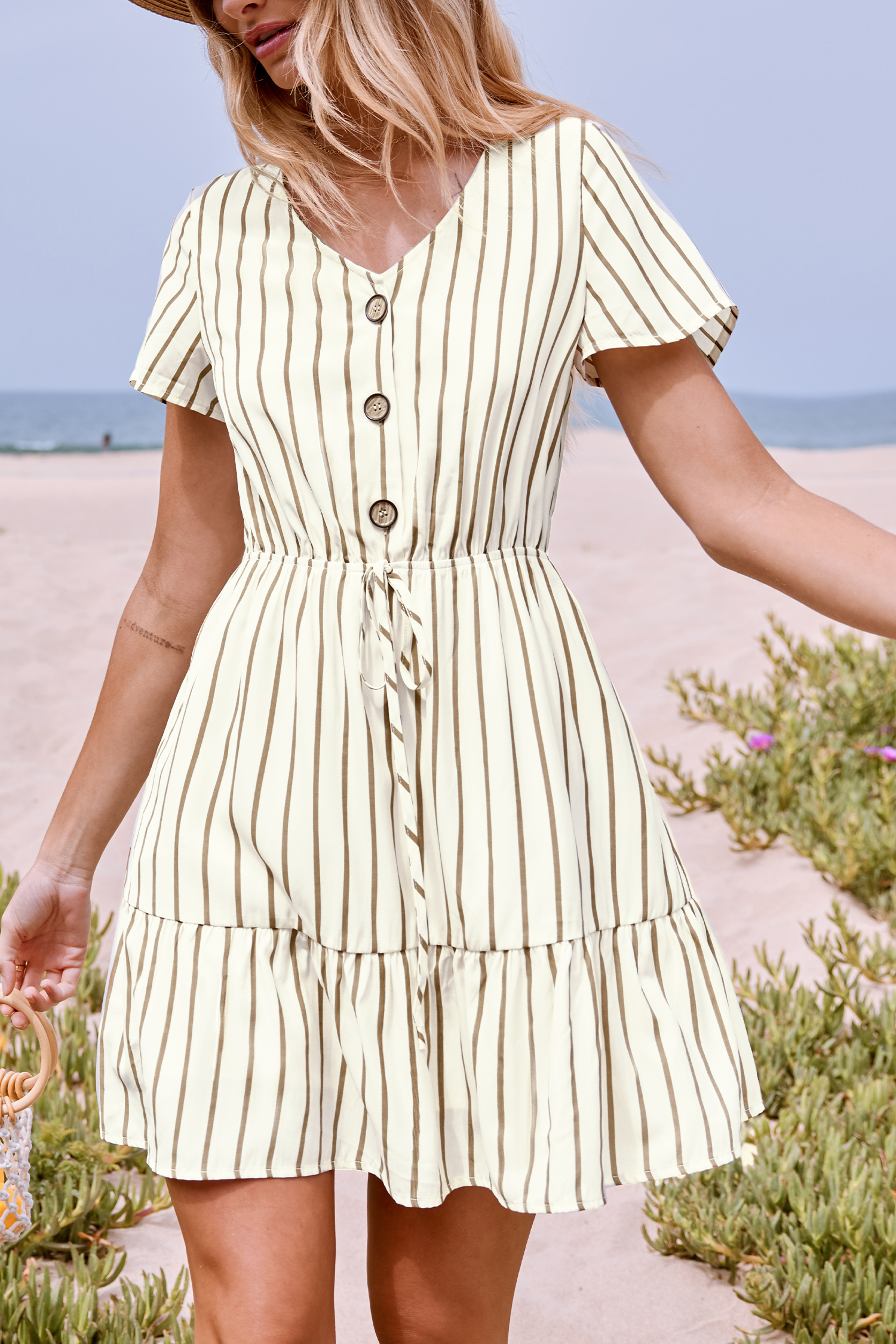 Neutrales gestreiftes Kurzarm-Minikleid mit V-Ausschnitt