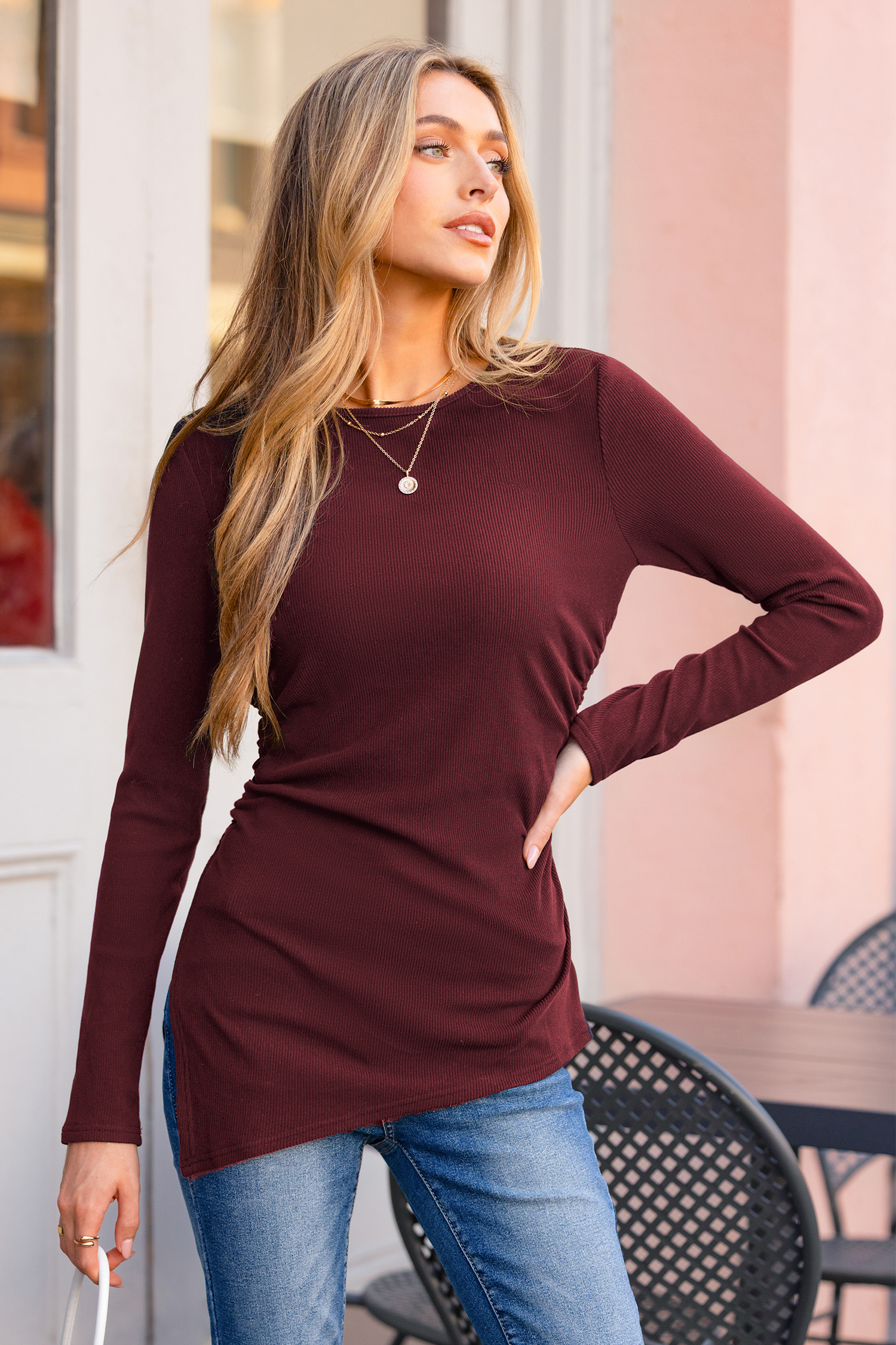 Das rote Top versprüht lässigen Model-Off-Duty-Flair! Mit Rundhalsausschnitt, langen Ärmeln und asymmetrischem Schlitz am Saum lässt es sich perfekt mit Jeans und Röcken kombinieren und ist so der ideale Begleiter für die Stadt.
