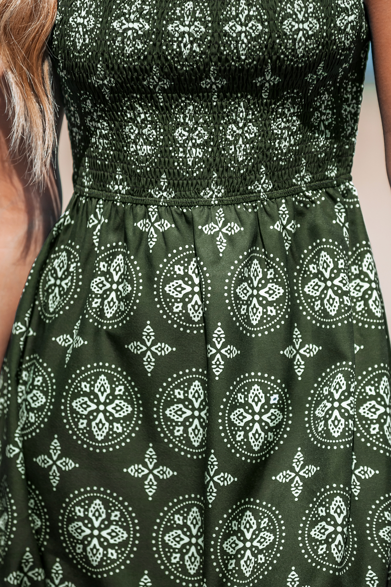 Olivfarbenes Boho-Mini-Schlauchkleid mit gesmoktem Oberteil