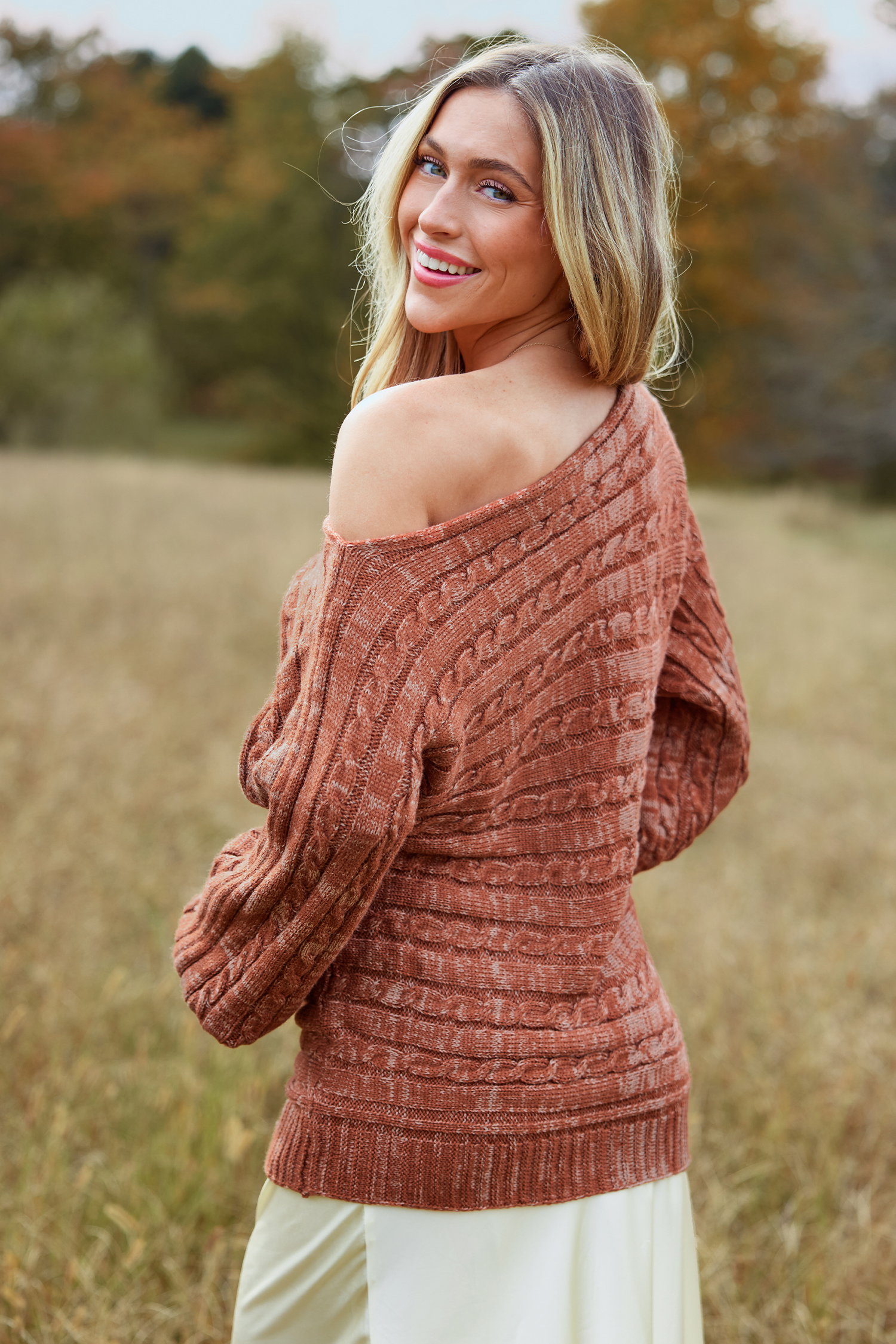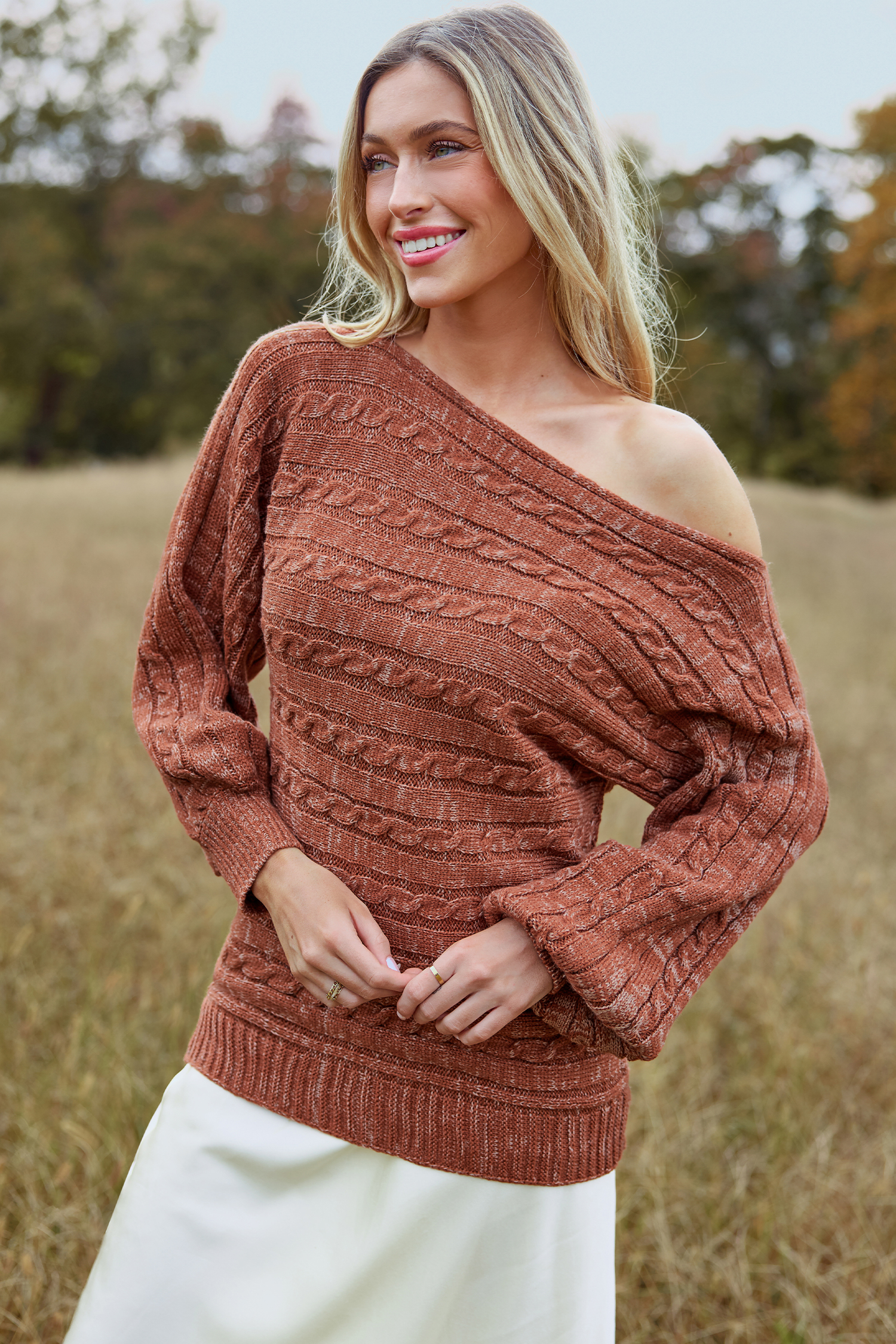 Orange schulterfreier Pullover aus Zopfstrick mit langen Ärmeln