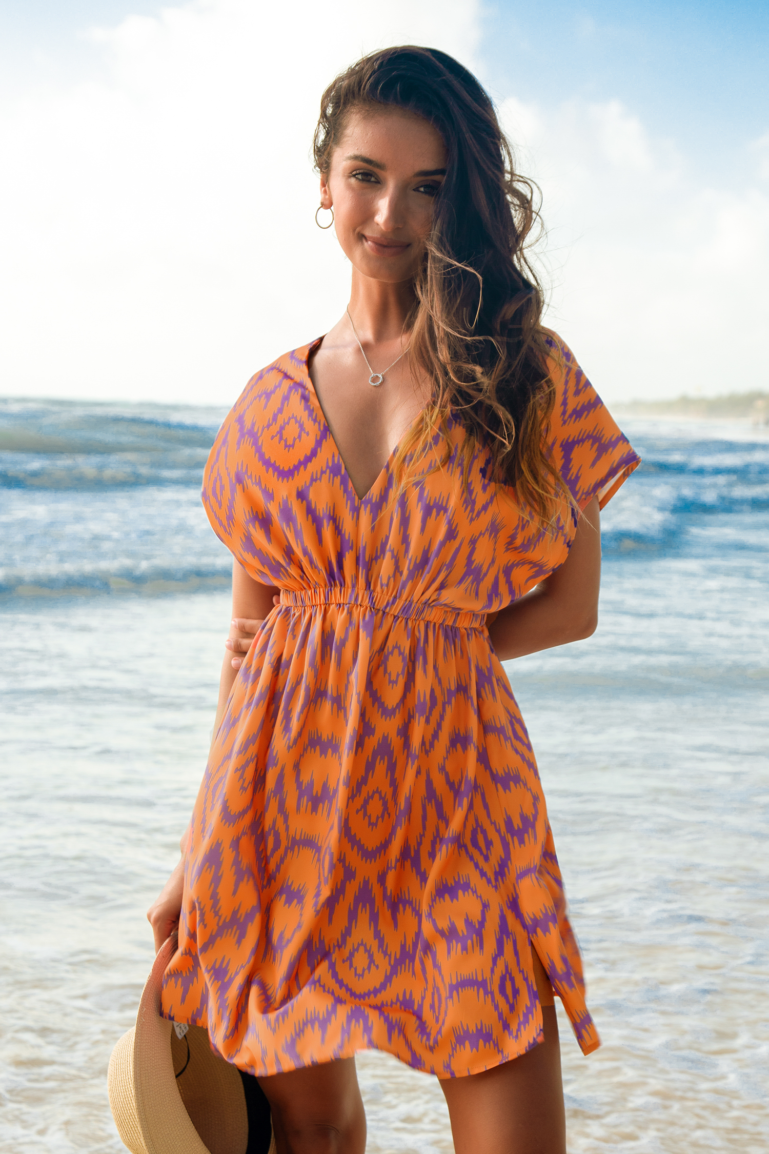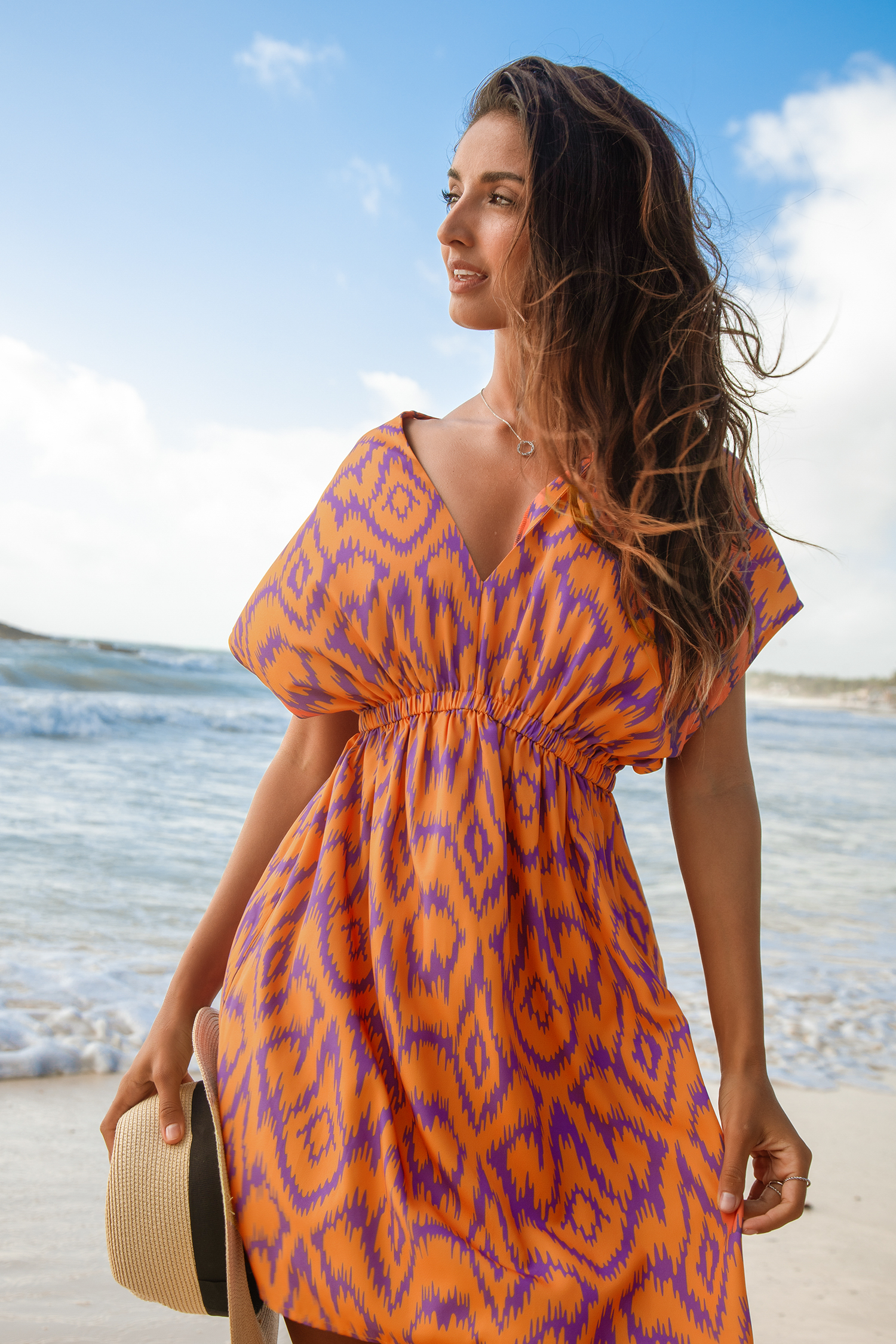 Orange & Lila Geo X-förmiges Minikleid mit Blasenärmeln