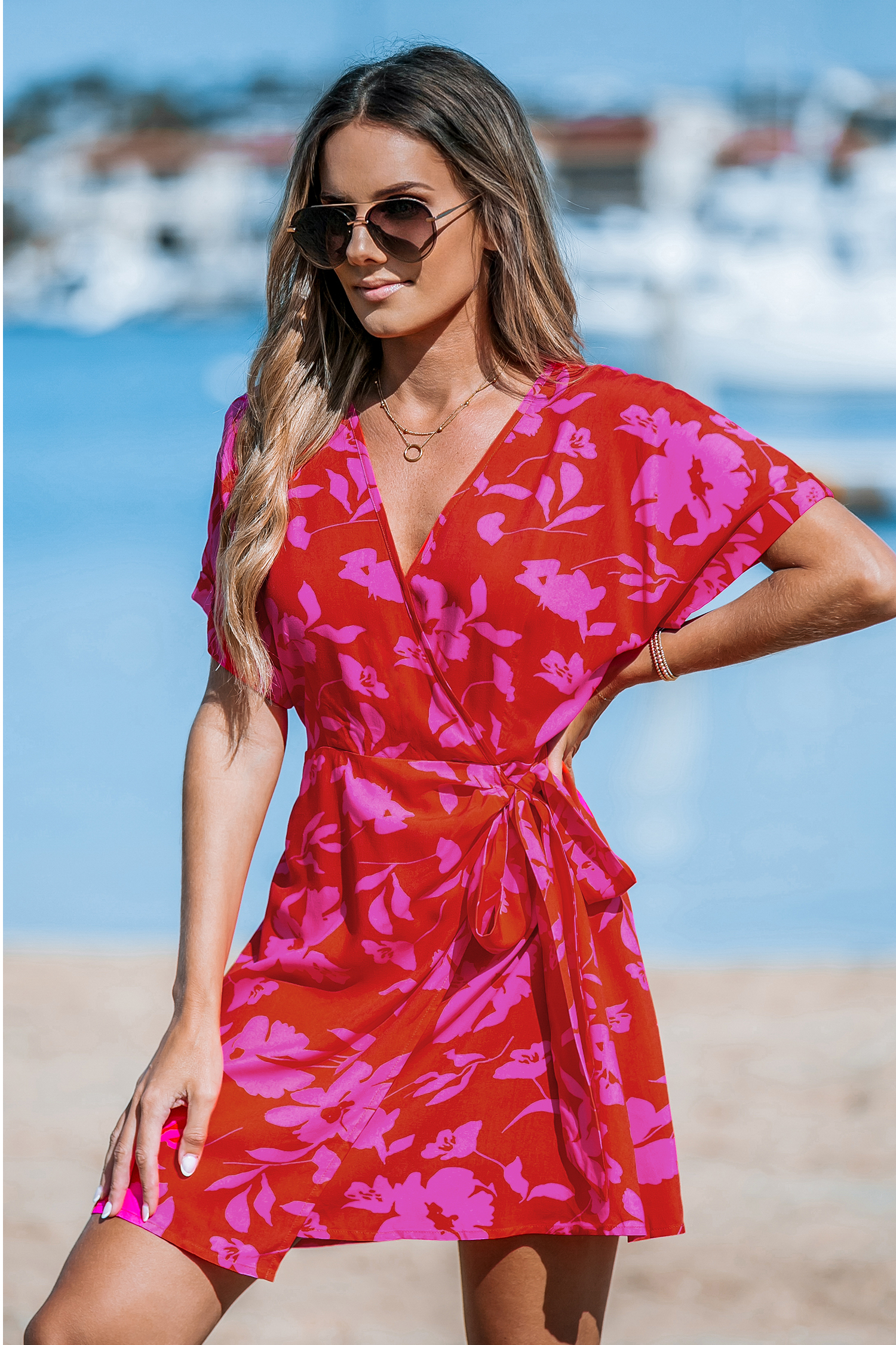 Rosa geblümtes Wickelminikleid mit seitlicher Bindung