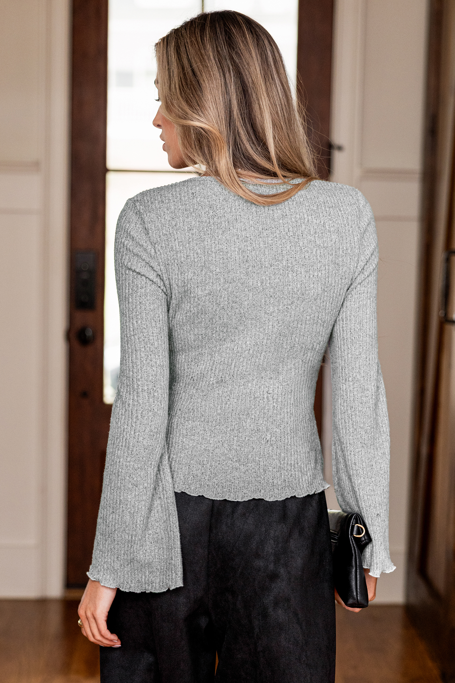 Das graue Top bietet Stil, auf den Sie sich verlassen können! Ein herzförmiger Ausschnitt und lange Glockenärmel verleihen ihm eine verspielte, romantische Passform.