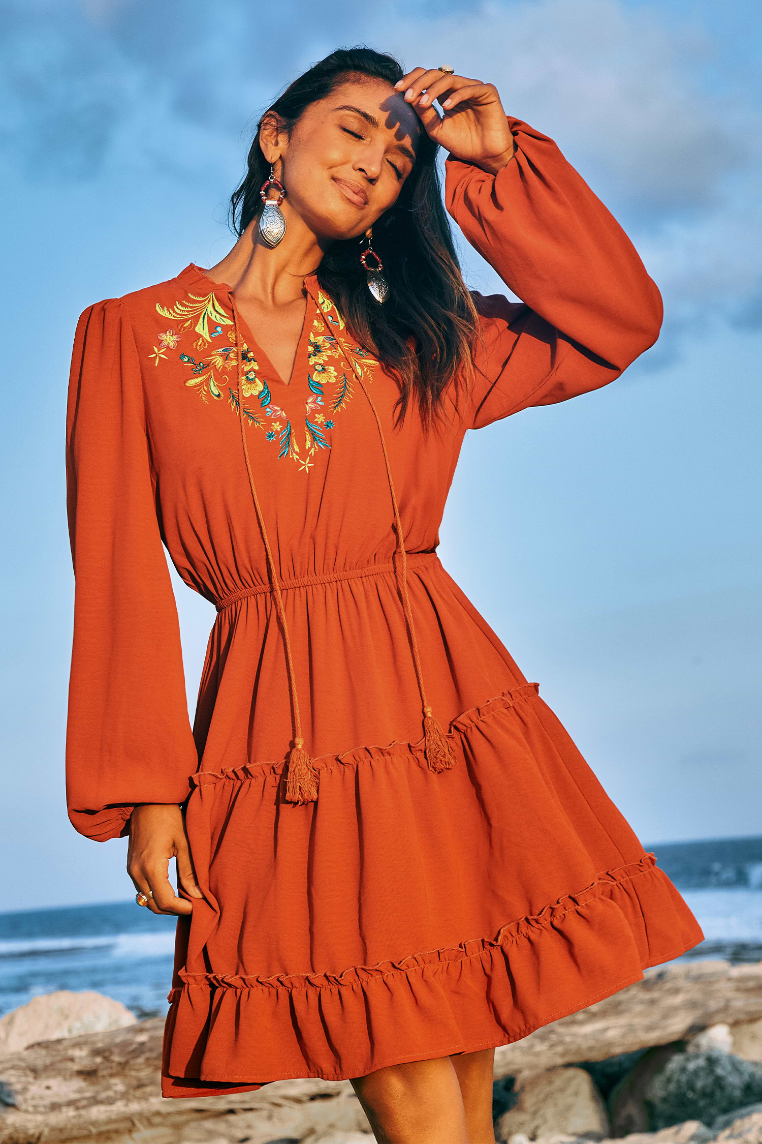 Starten Sie in den Herbst mit dem orangefarbenen Minikleid! Der gekerbte Ausschnitt, die langen Ärmel und die Minilänge sorgen für kuschelig-süße Stimmung, perfekt für frische Herbsttage.