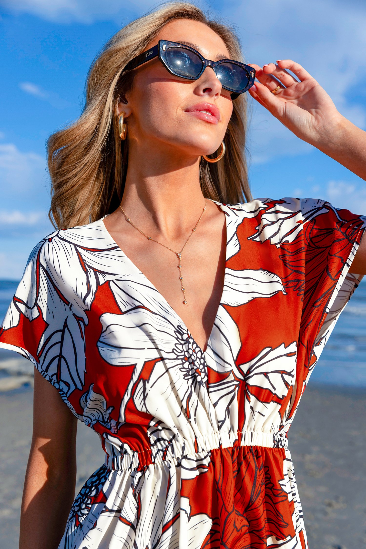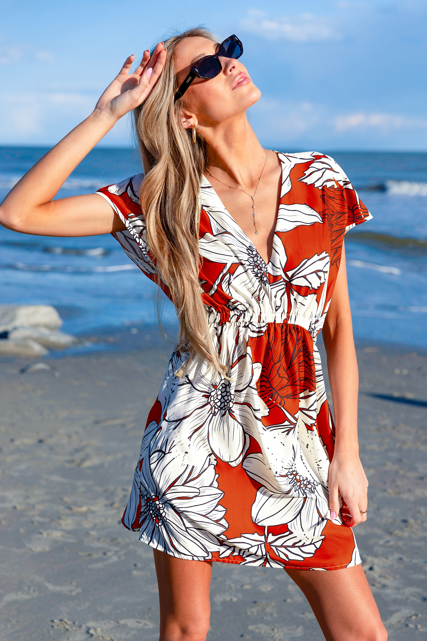 Rotes Minikleid mit großen geblümten Dolman-Ärmeln
