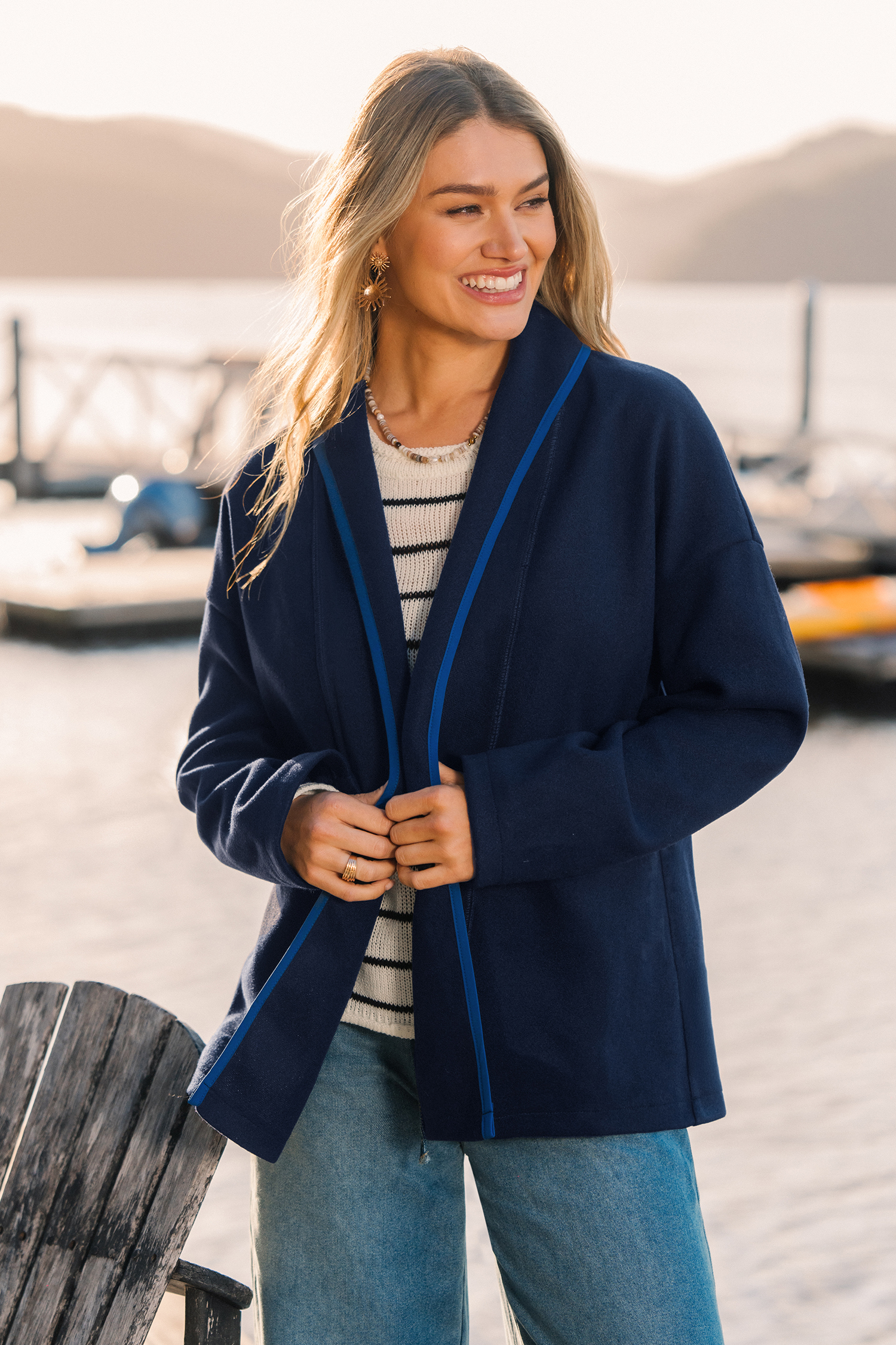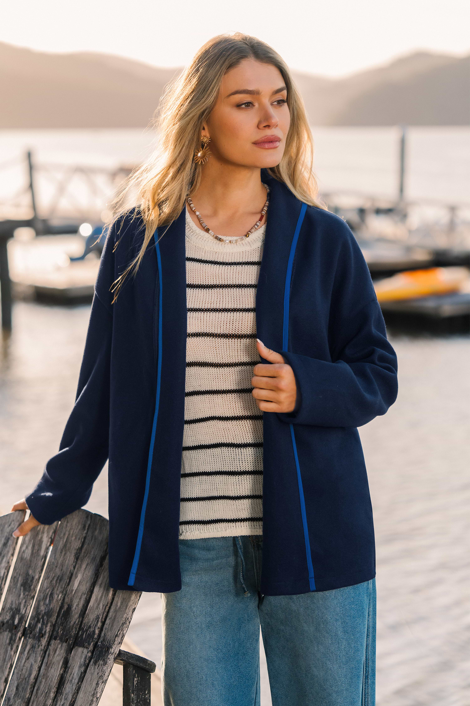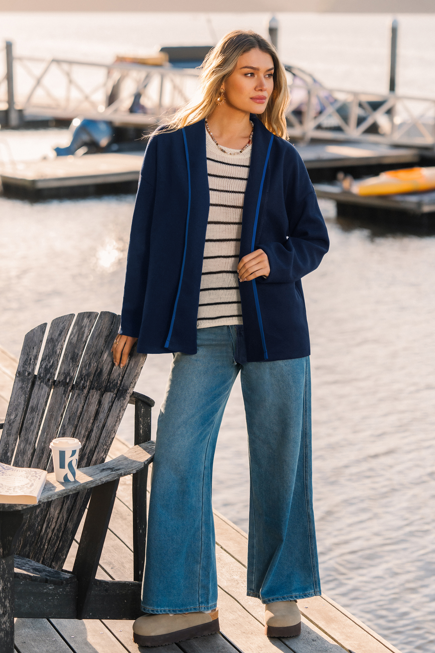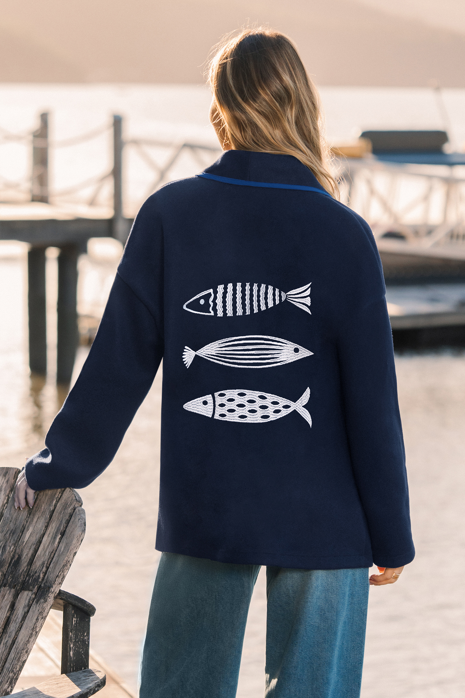 Der blaue Mantel ist verspielt, verspielt und voller Persönlichkeit! Sein Kragenausschnitt, die langen Ärmel und die gestickten Fischdetails verleihen ihm einen auffälligen Look, der verspielt und dennoch tragbar ist.