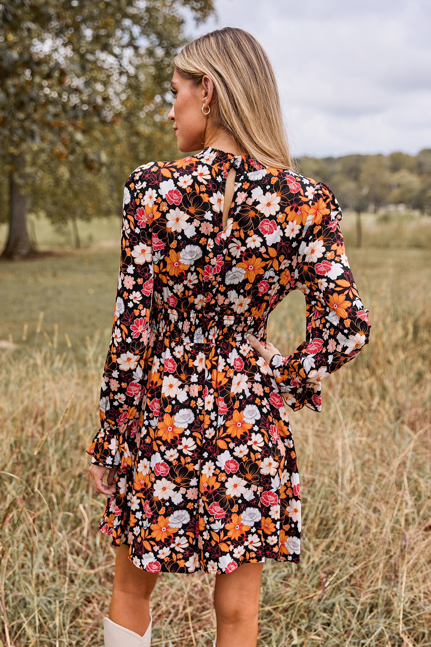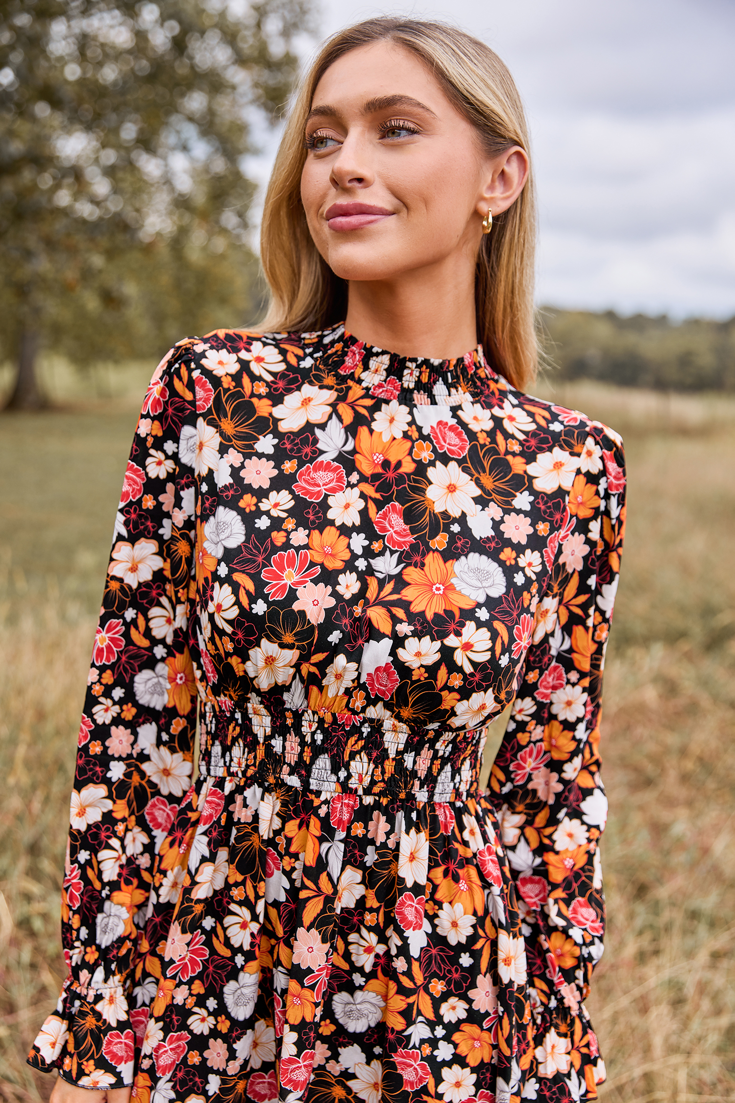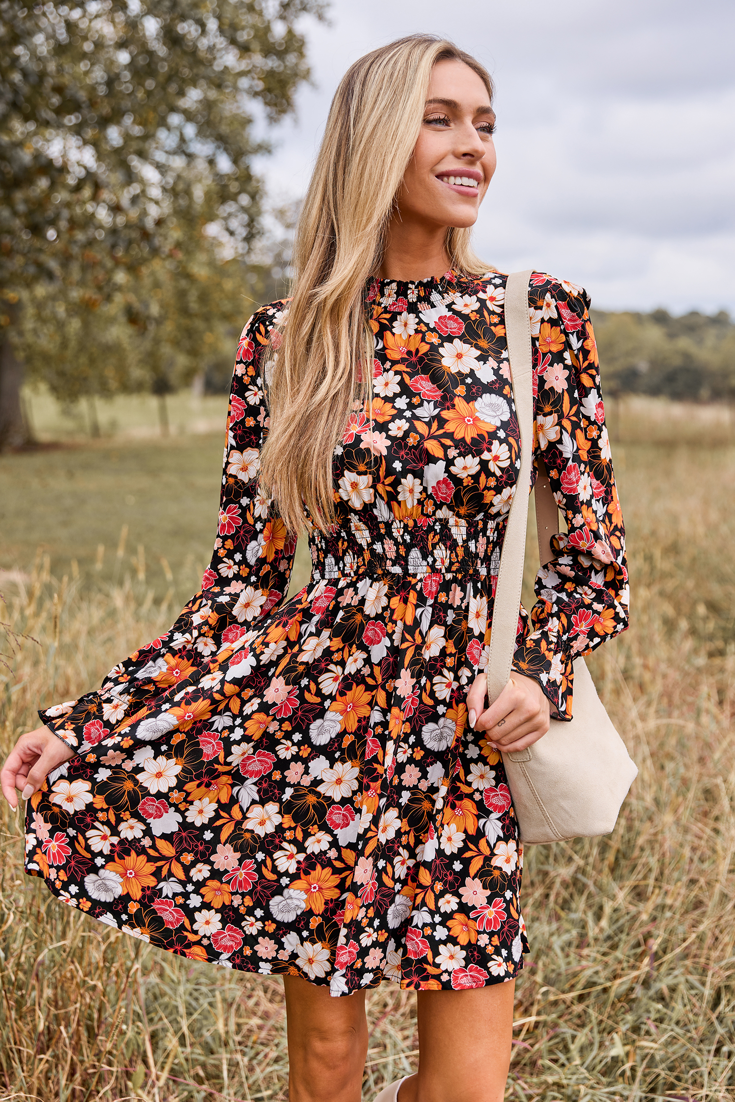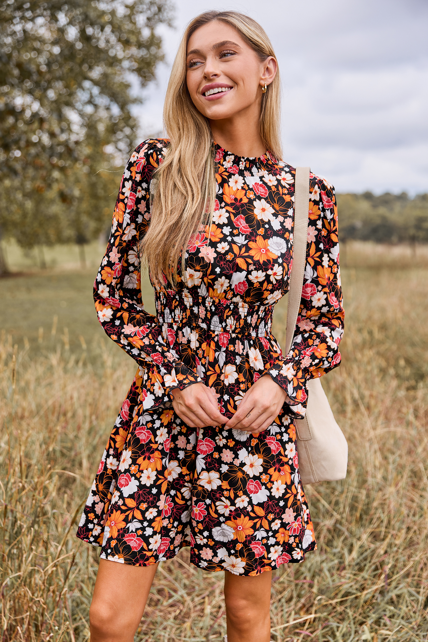 Geblümtes Retro-Minikleid mit gesmokter Taille und Dichterärmeln