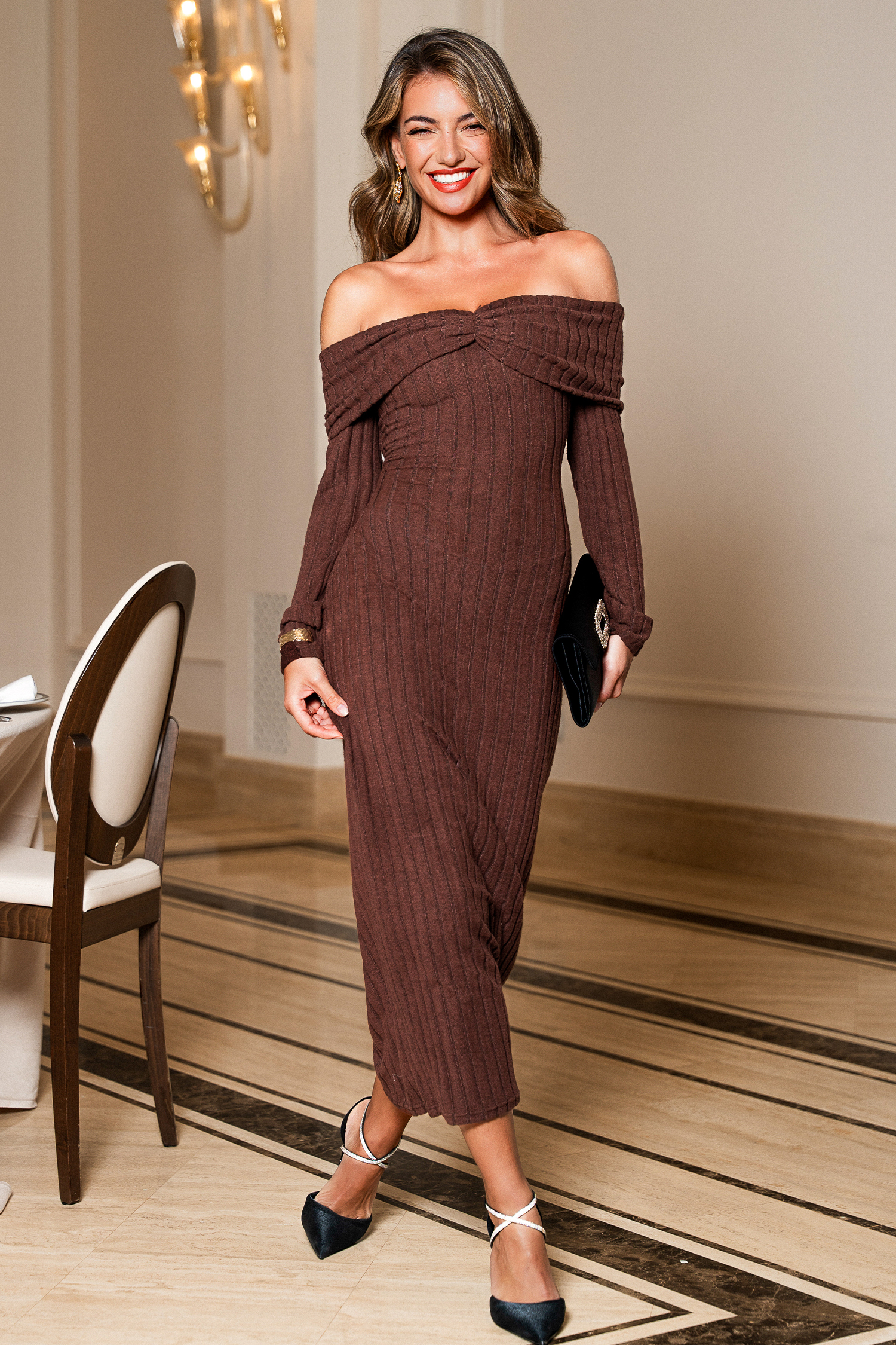 Das Maxikleid versprüht ikonische Energie und ist wie geschaffen für einen königlichen Auftritt! Es besticht durch einen schulterfreien Ausschnitt, lange Ärmel und eine fließende Maxilänge für einen dramatischen Look.