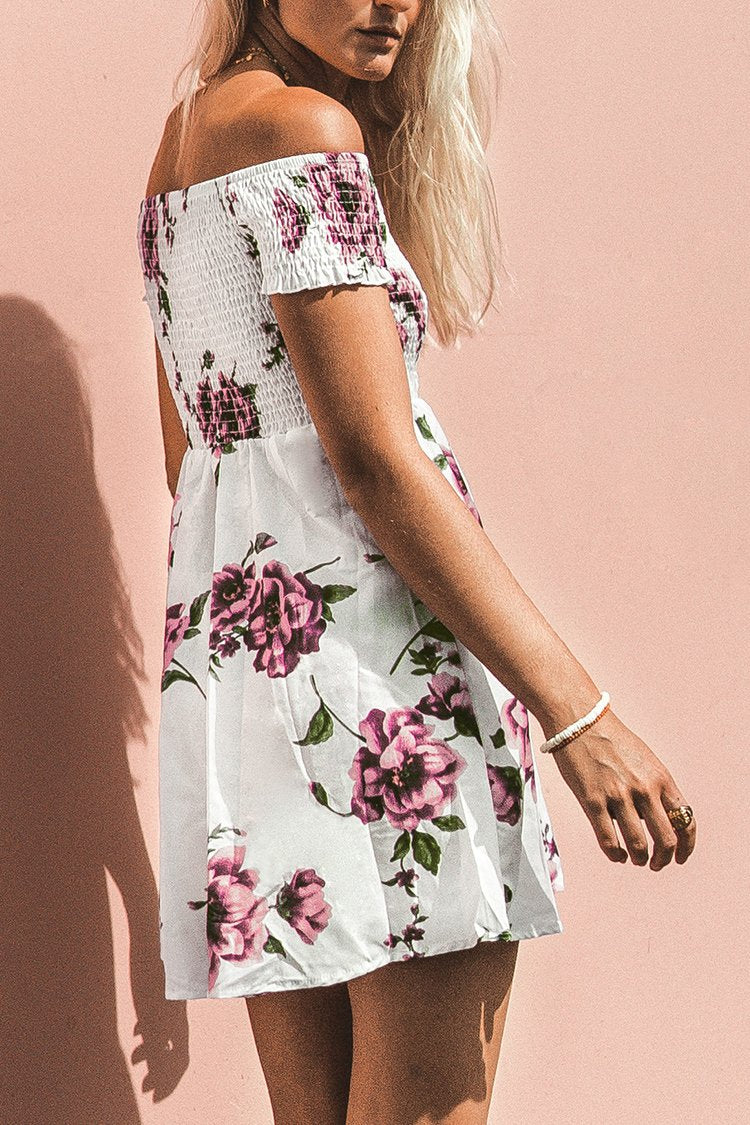 Rose Drucken gesmockte Schulter Kleid