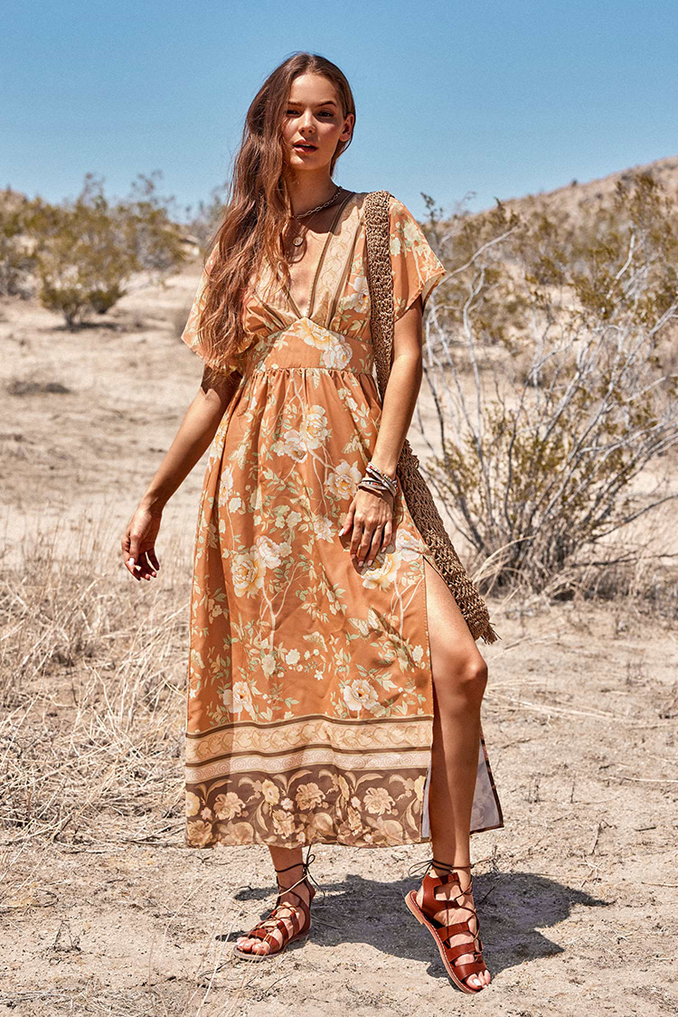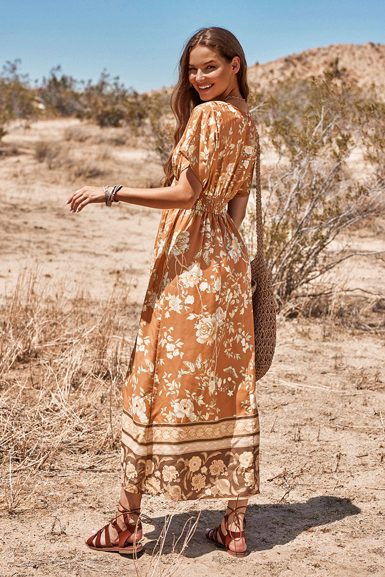 Rüschenkleid mit ausgestellten Ärmeln und tiefem V-Ausschnitt