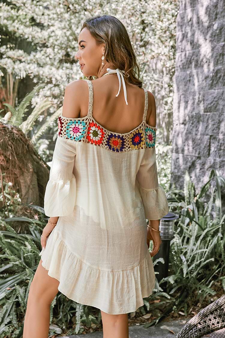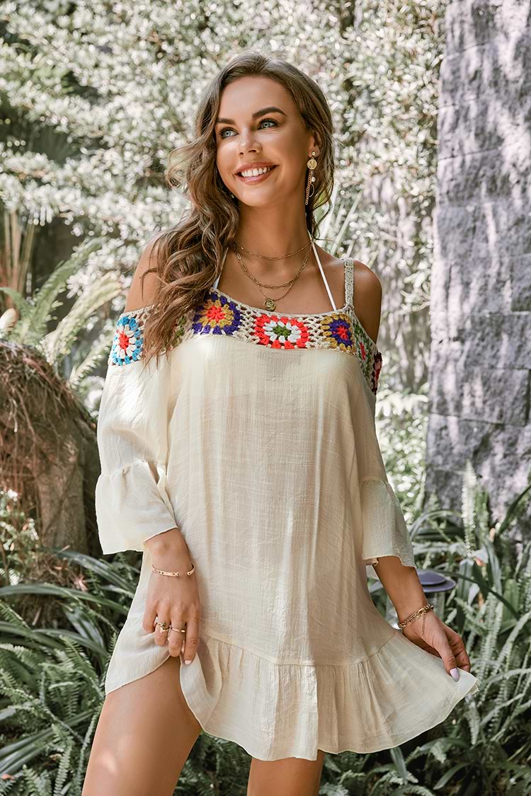 Schulterfreies Rüschen Cover Up mit dünnen Trägern und ethnischem Druck