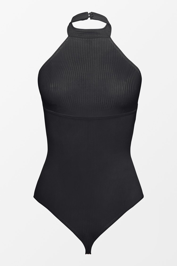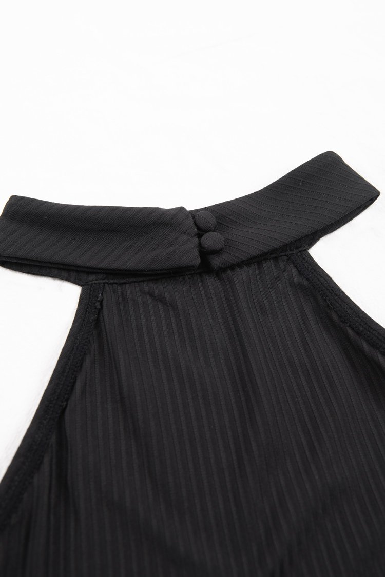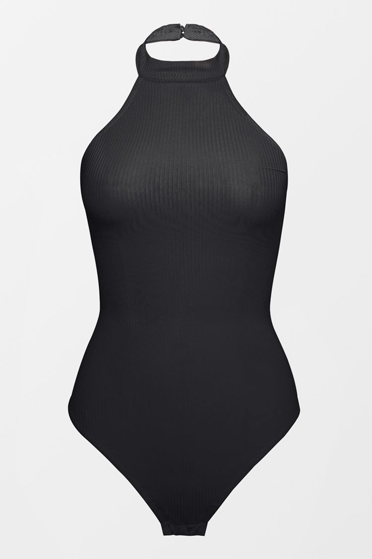 HomeSchwarzer gerippter Neckholder-Bodysuit