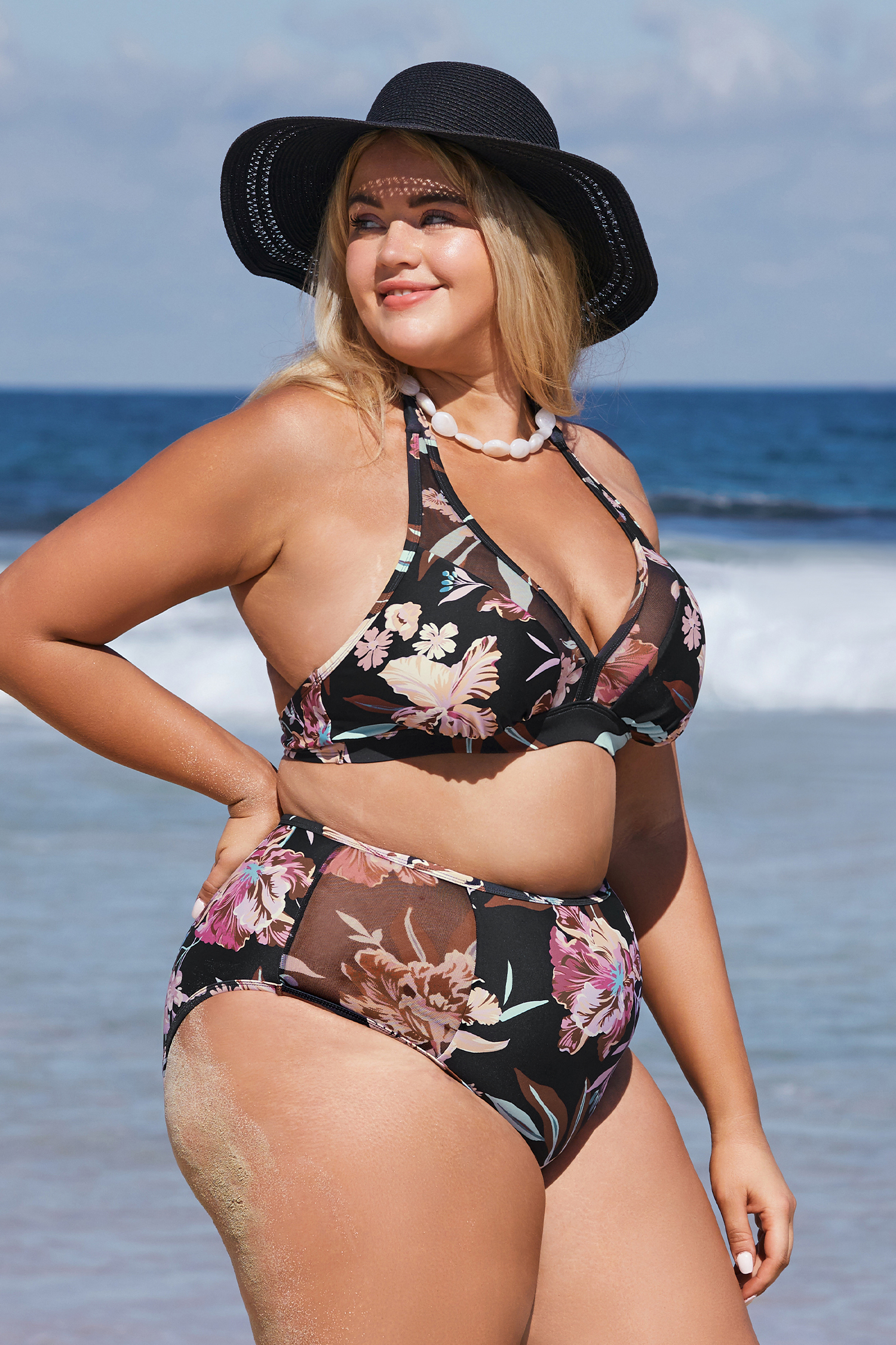 Schwarzes Neckholder-Top & Hochtailliertes Bikini-Set in Übergröße