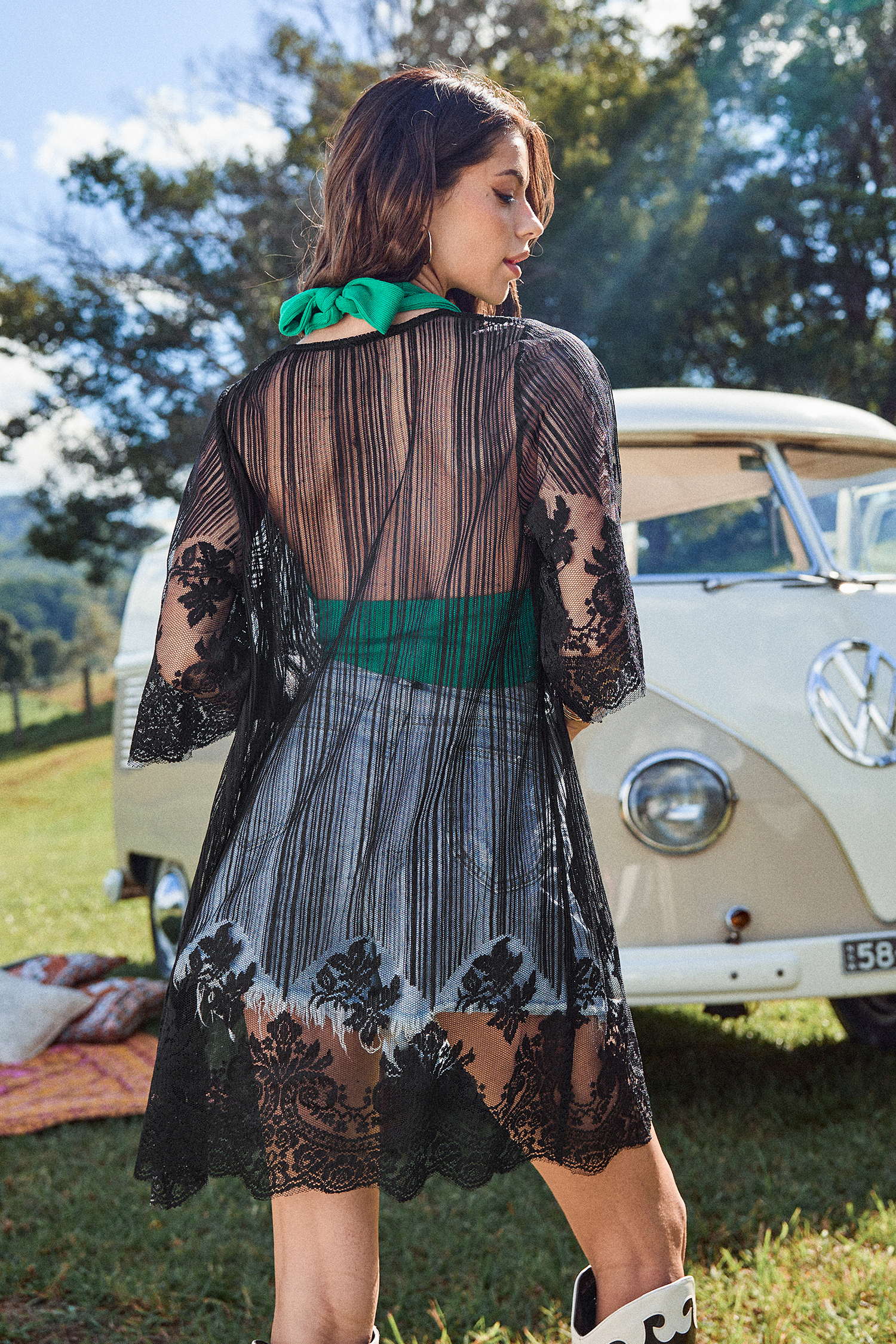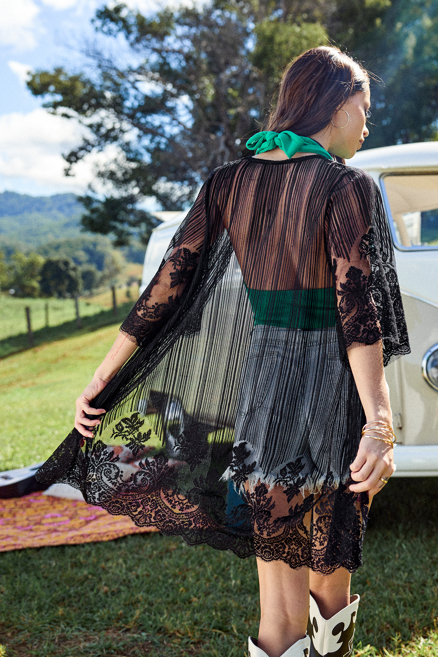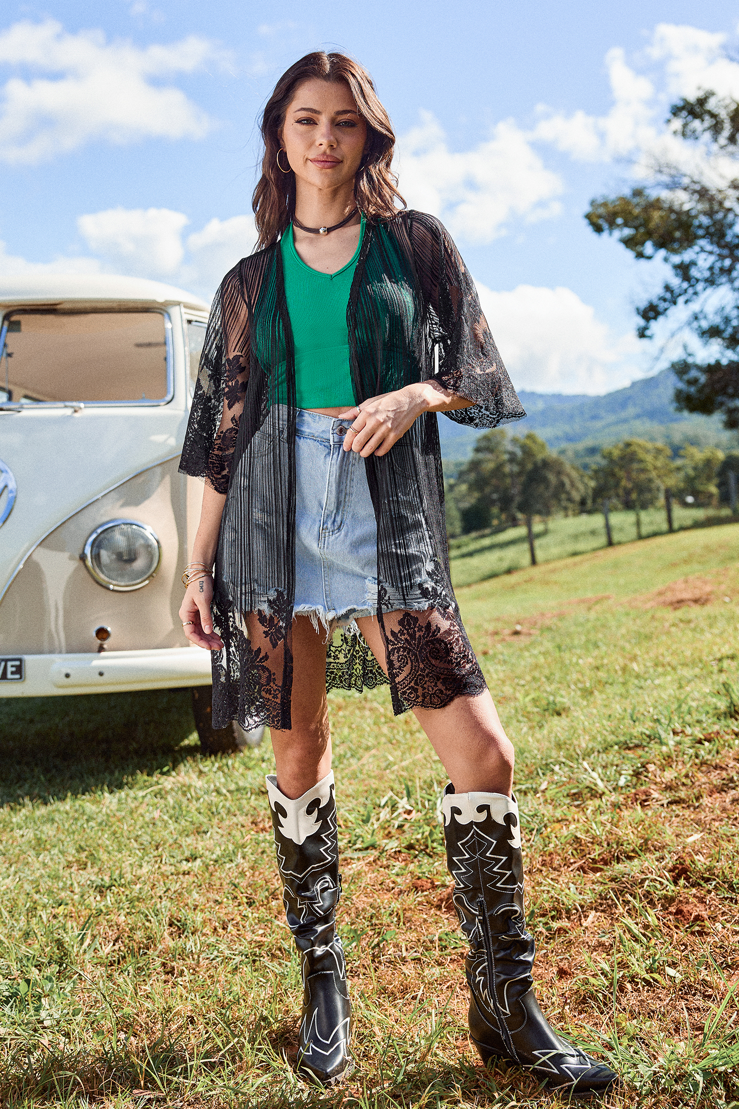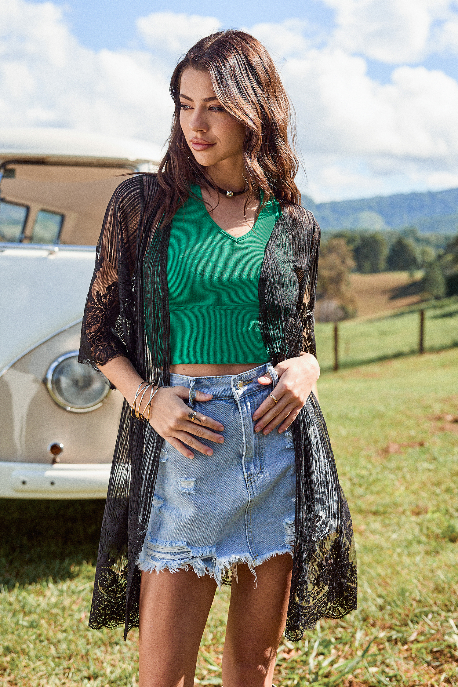 Schwarzes durchsichtiges besticktes Top mit offener Vorderseite