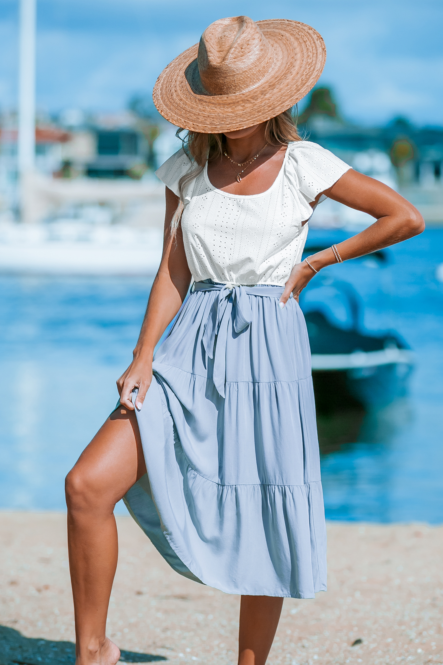 Kurzärmeliges Midikleid aus weißem T-Shirt und hellblauem Rock