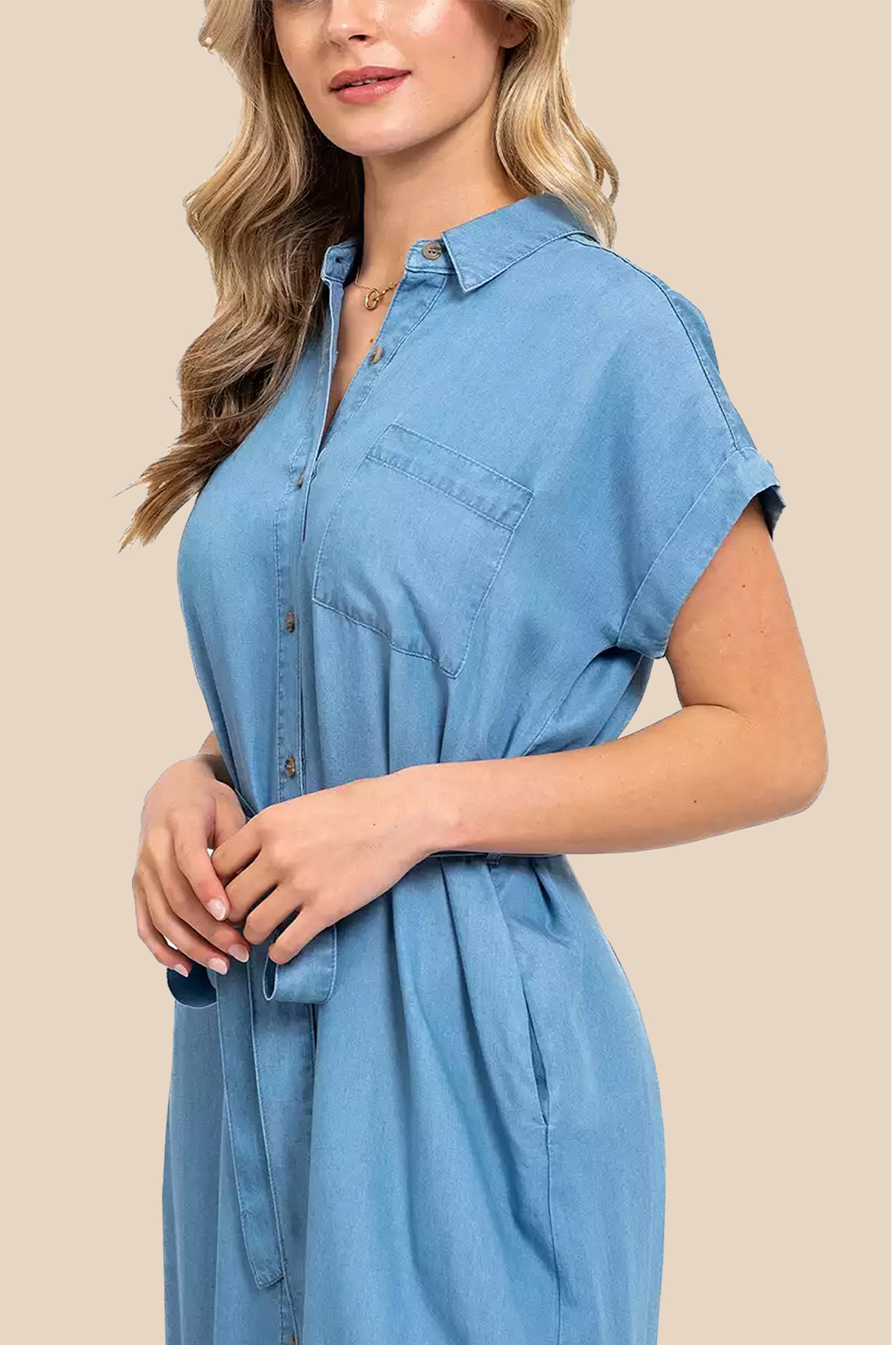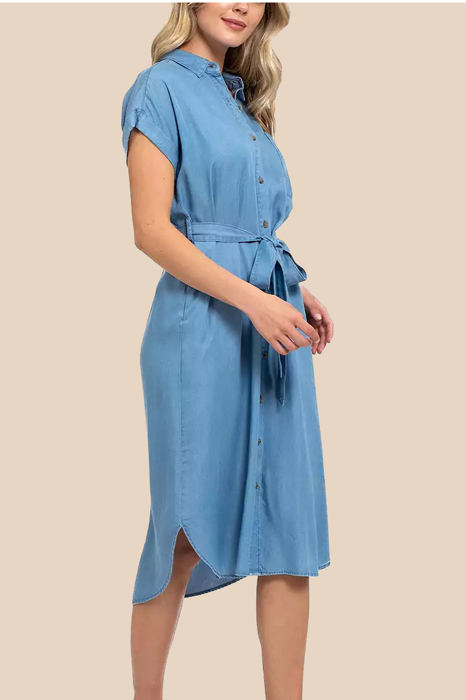 Himmelblaues Midi-T-Shirt-Kleid mit Kragen und Knopfleiste