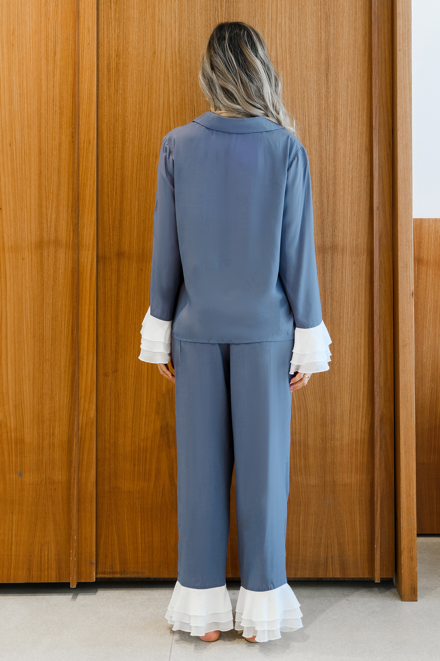 Schieferblaues Pyjama-Set mit Spitzenbündchen