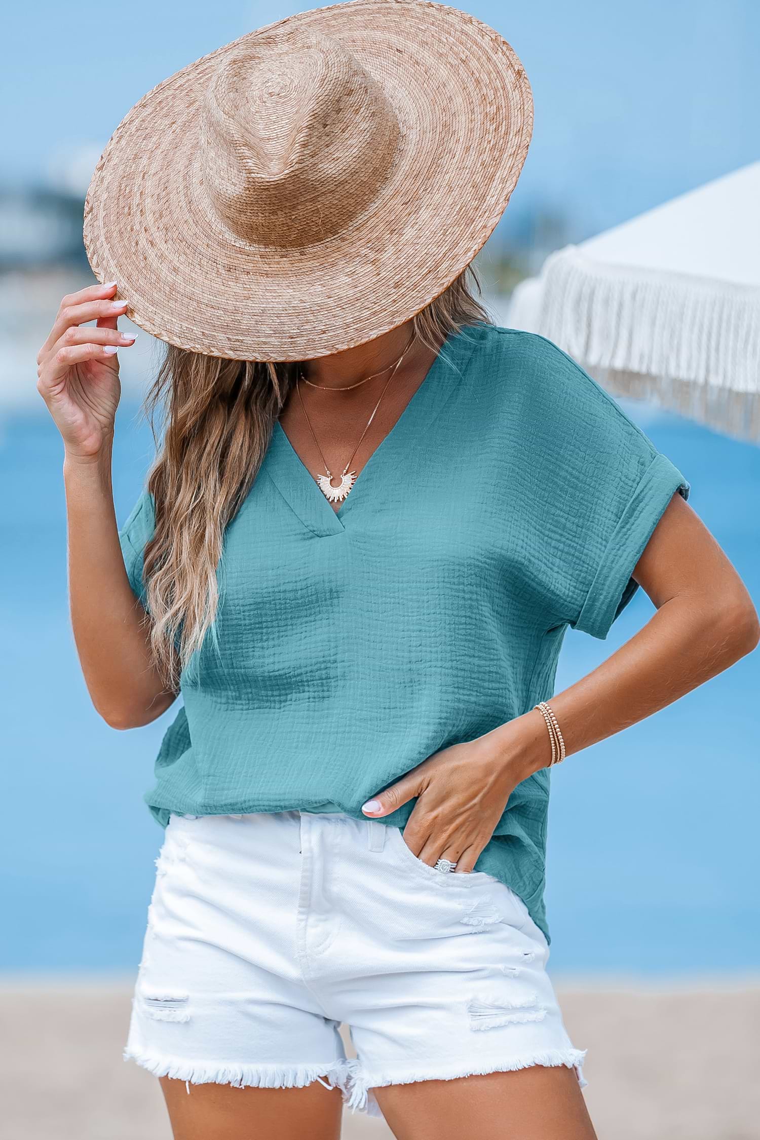 Schieferfarbenes Baumwoll-Top mit Dolman-Ärmeln und V-Ausschnitt