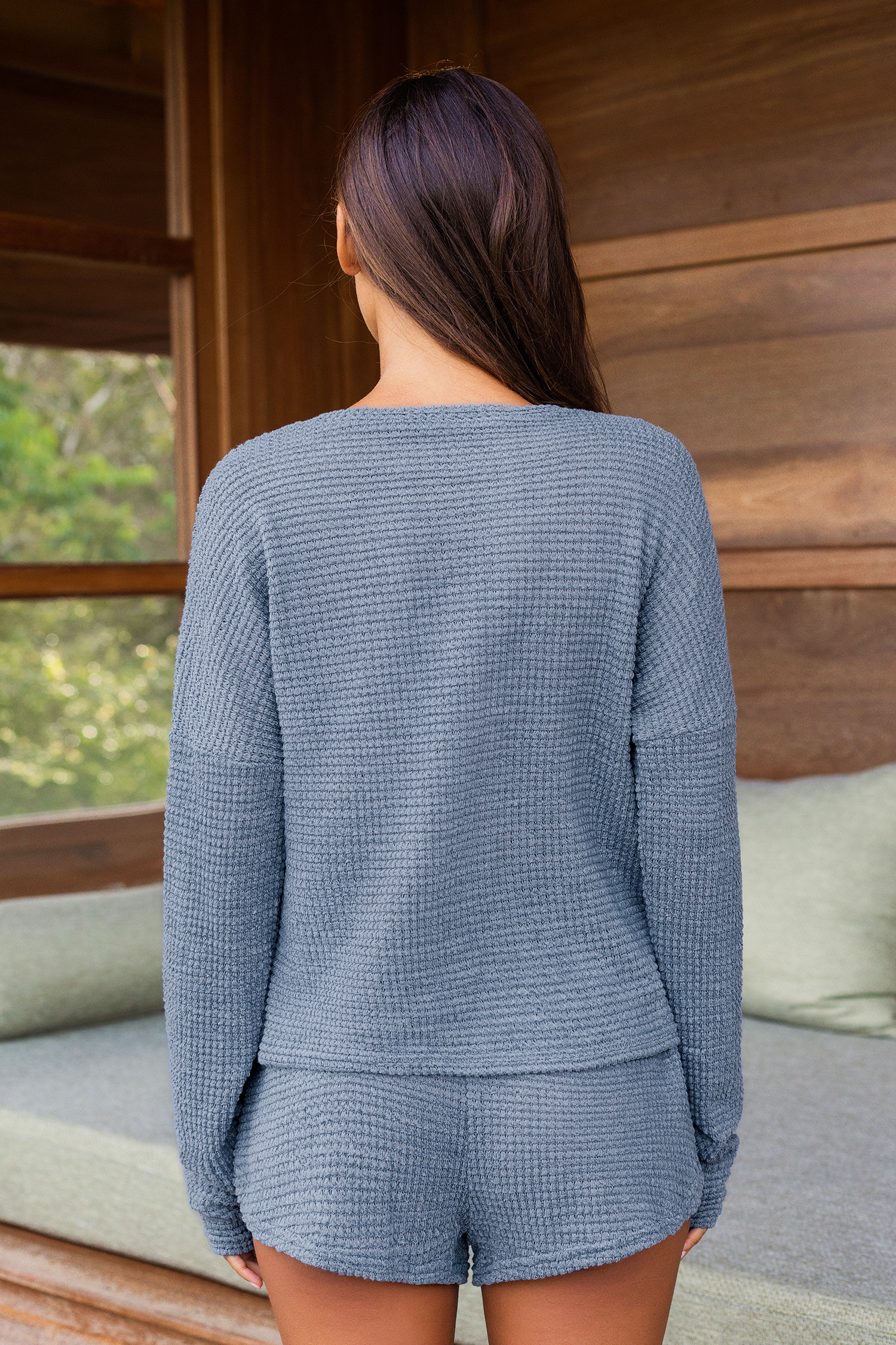 Schieferfarbenes Waffelstrick-Pyjama-Set mit langen Ärmeln
