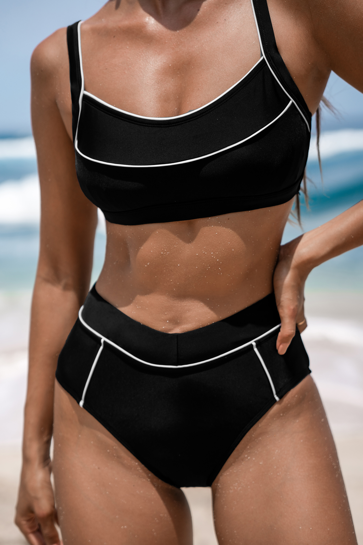 Schwarzes Bikini-Oberteil & High Waist Bikinihose mit V-Vorderteil