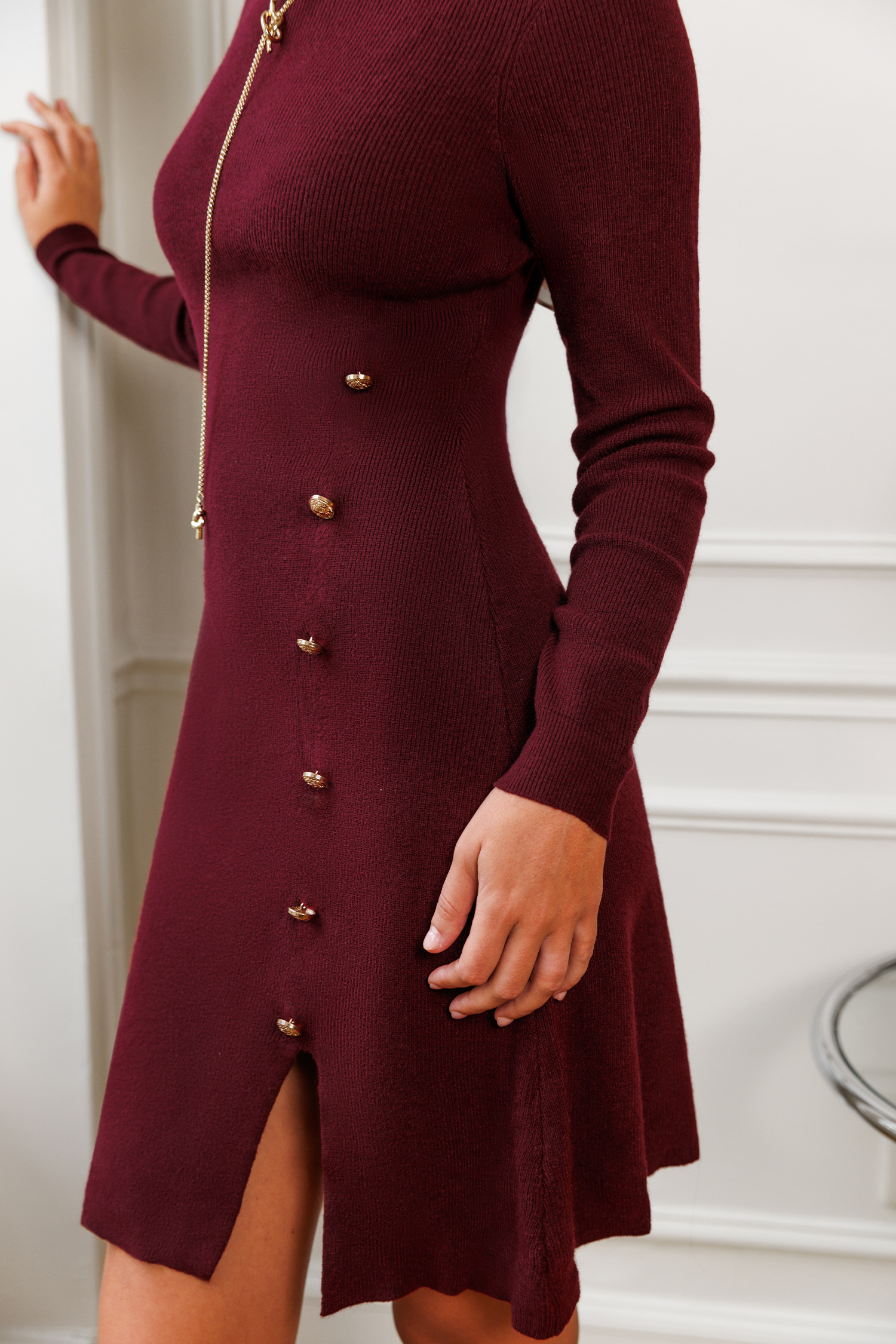 Das weinrote Strickkleid ist kuschelig, verspielt und elegant! Der hohe Ausschnitt, die langen Ärmel, die Minilänge und der Seitenschlitz verleihen ihm eine kokette, selbstbewusste Ausstrahlung – perfekt, um Eindruck zu machen.