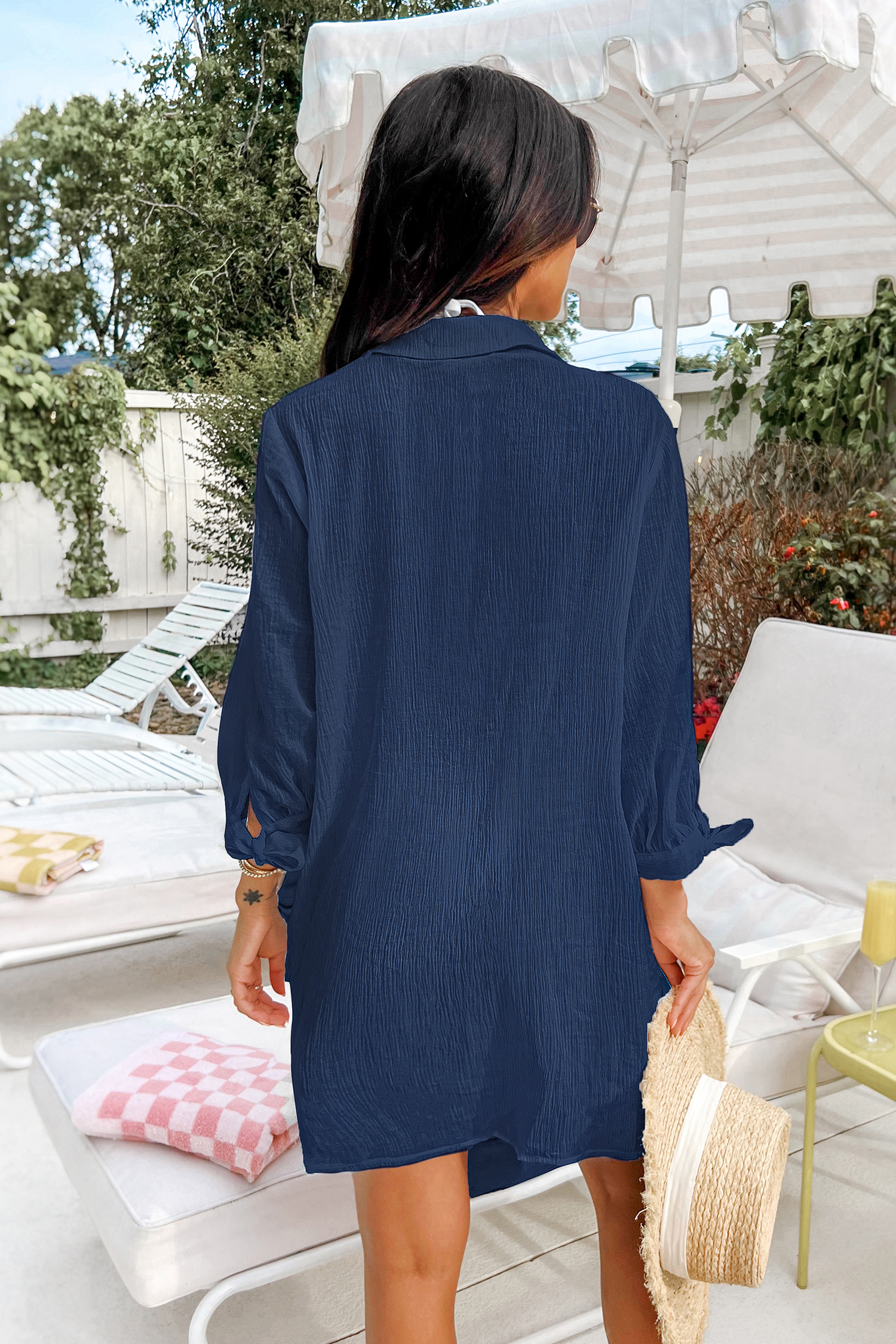 Das blaue Strandkleid versprüht lässigen Strand- und Lounge-Charme mit dem gewissen Etwas! Der V-Ausschnitt und die langen Ärmel gleichen die Minilänge aus und machen es zu einem lässigen, aber dennoch eleganten Kleidungsstück.