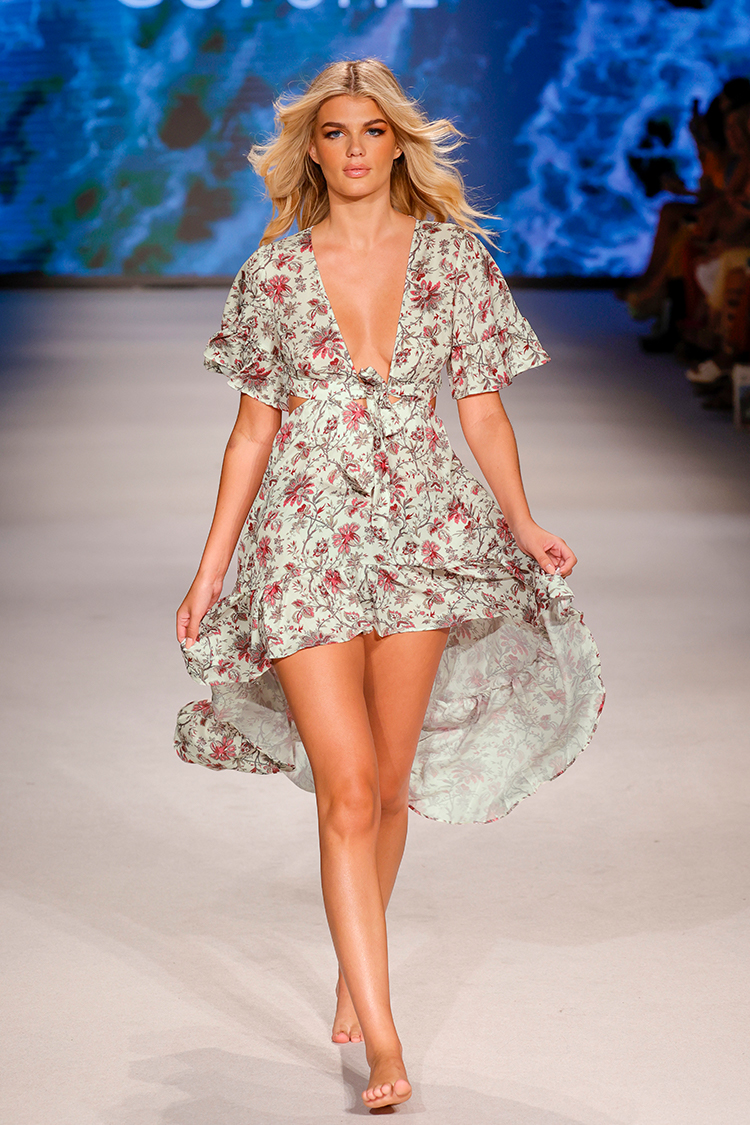 Tiefer V-Ausschnitt Elastische Taille binden A-förmiges Kleid mit Blumendruck