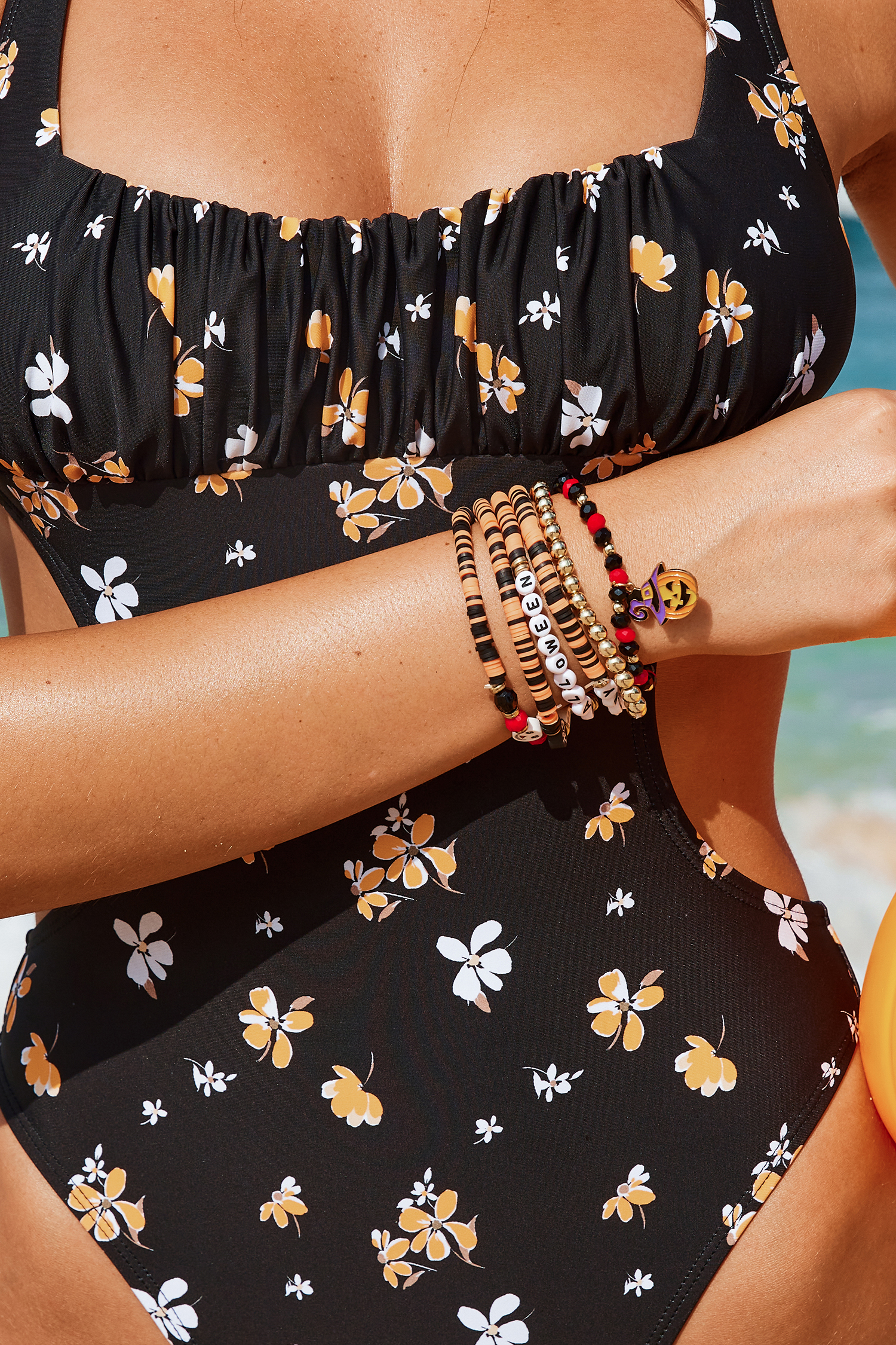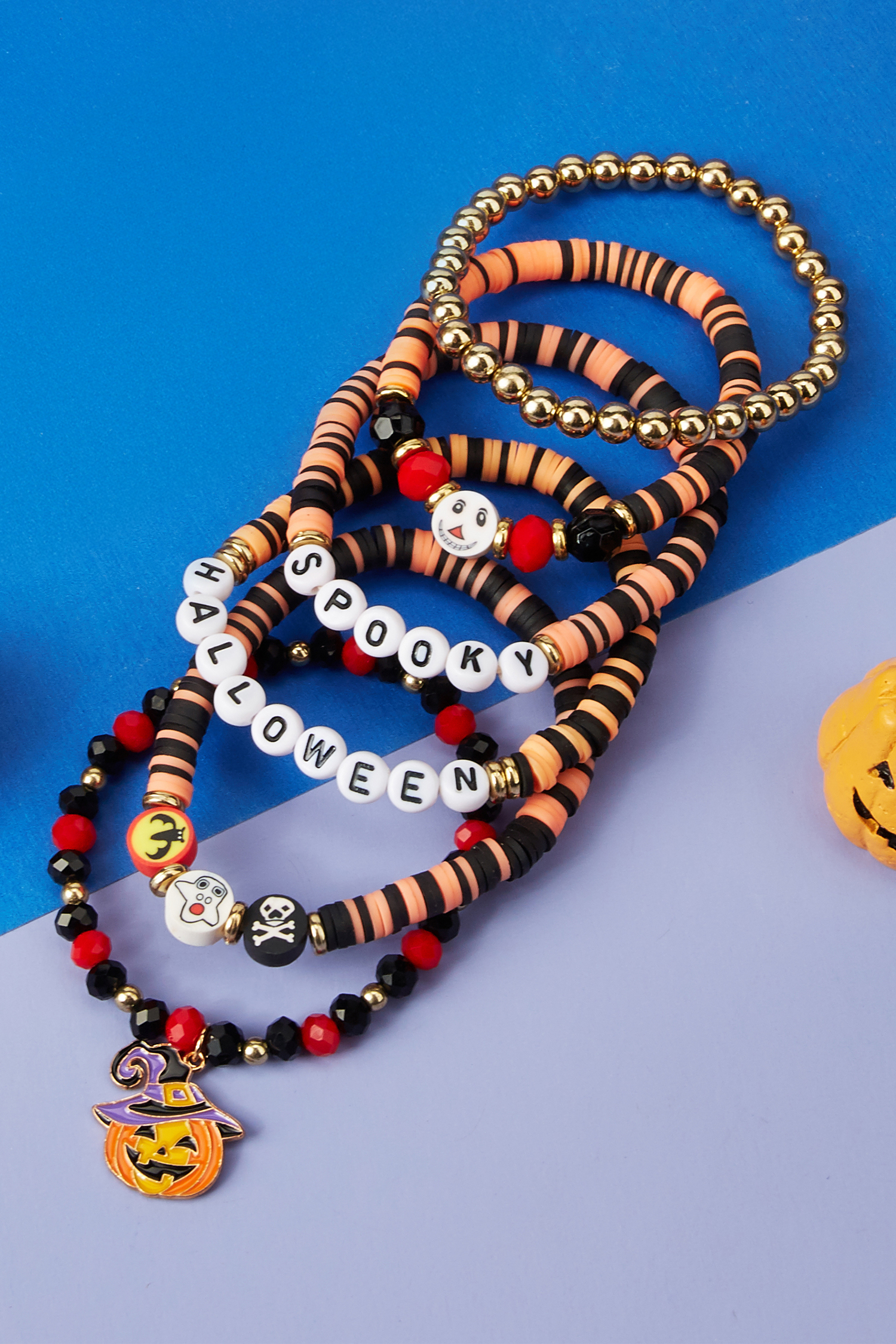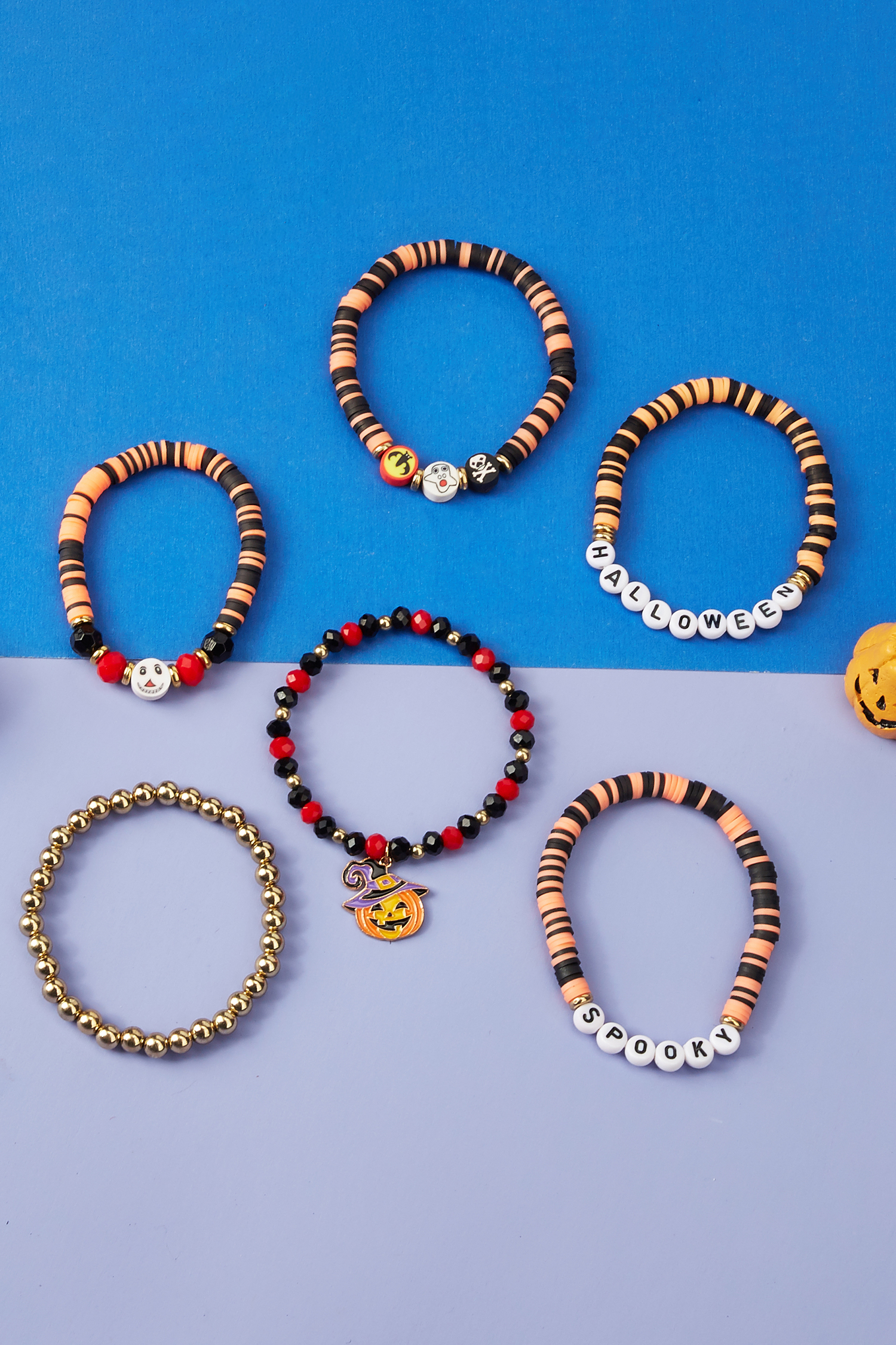 Das Perlenarmbandset verleiht jedem Look einen verspielten, festlichen Charme! Verschiedene Perlen und ein Kürbis-Anhänger sind das perfekte Halloween-Detail.