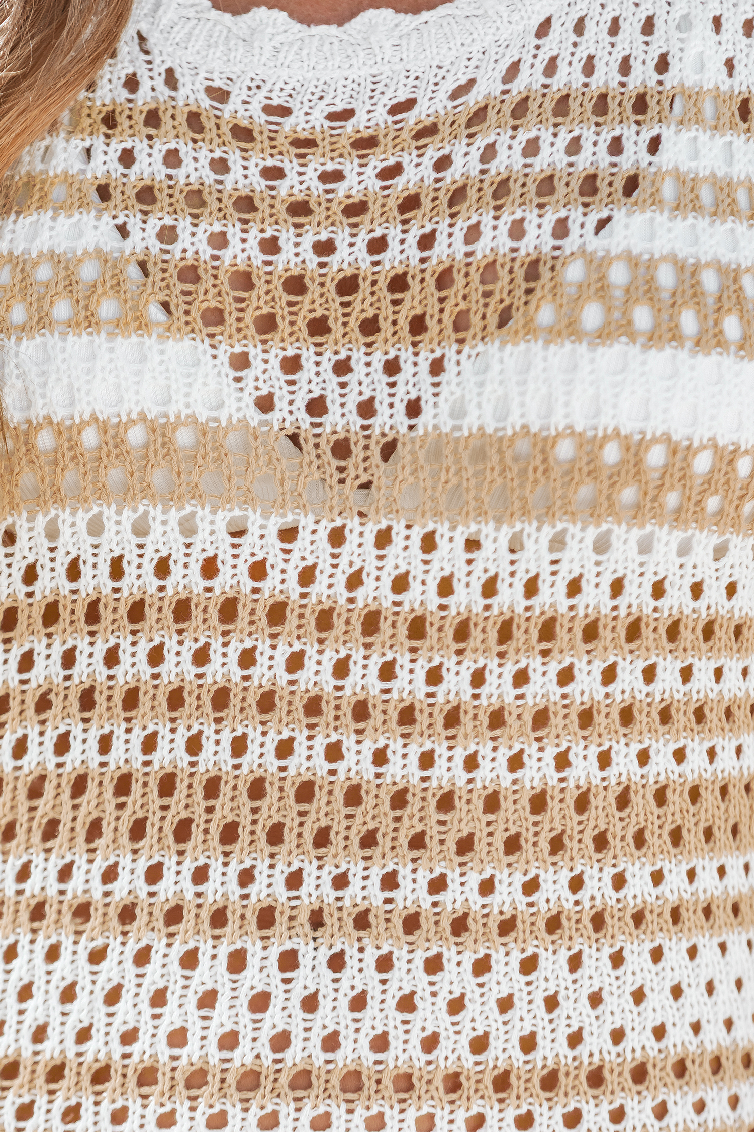 Für einen verspielten Auftritt sorgt das Streifen-Cover-Up-Minikleid! Rundhalsausschnitt, ärmelloser Schnitt, Rückenausschnitt und leicht transparenter Strickstoff machen es verspielt und unkompliziert.