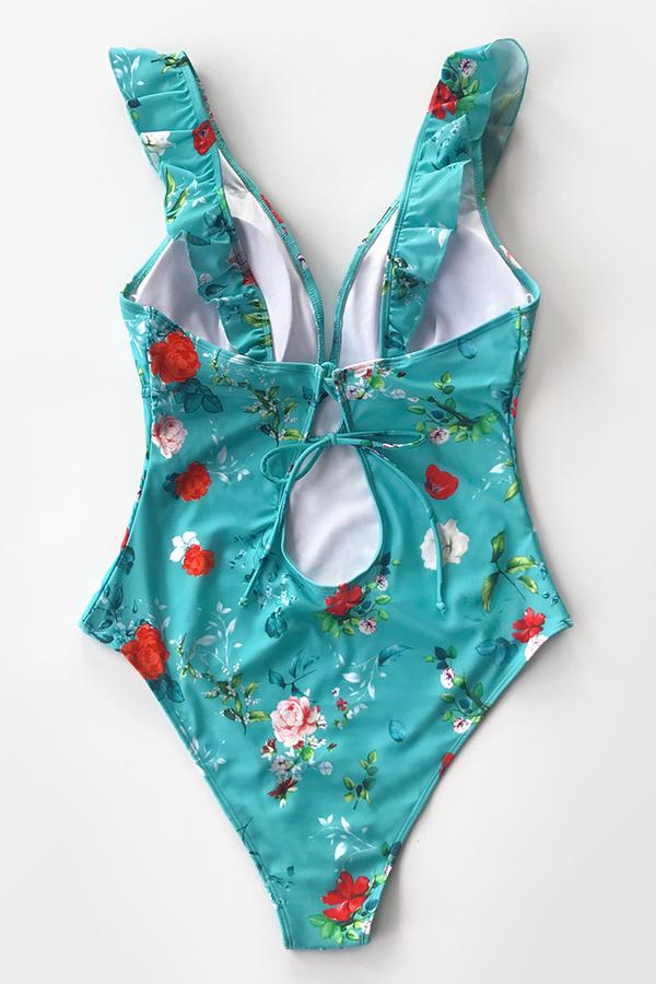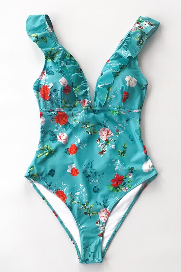 HomeTürkis Blumen gekräuselten V-Ausschnitt Badeanzug