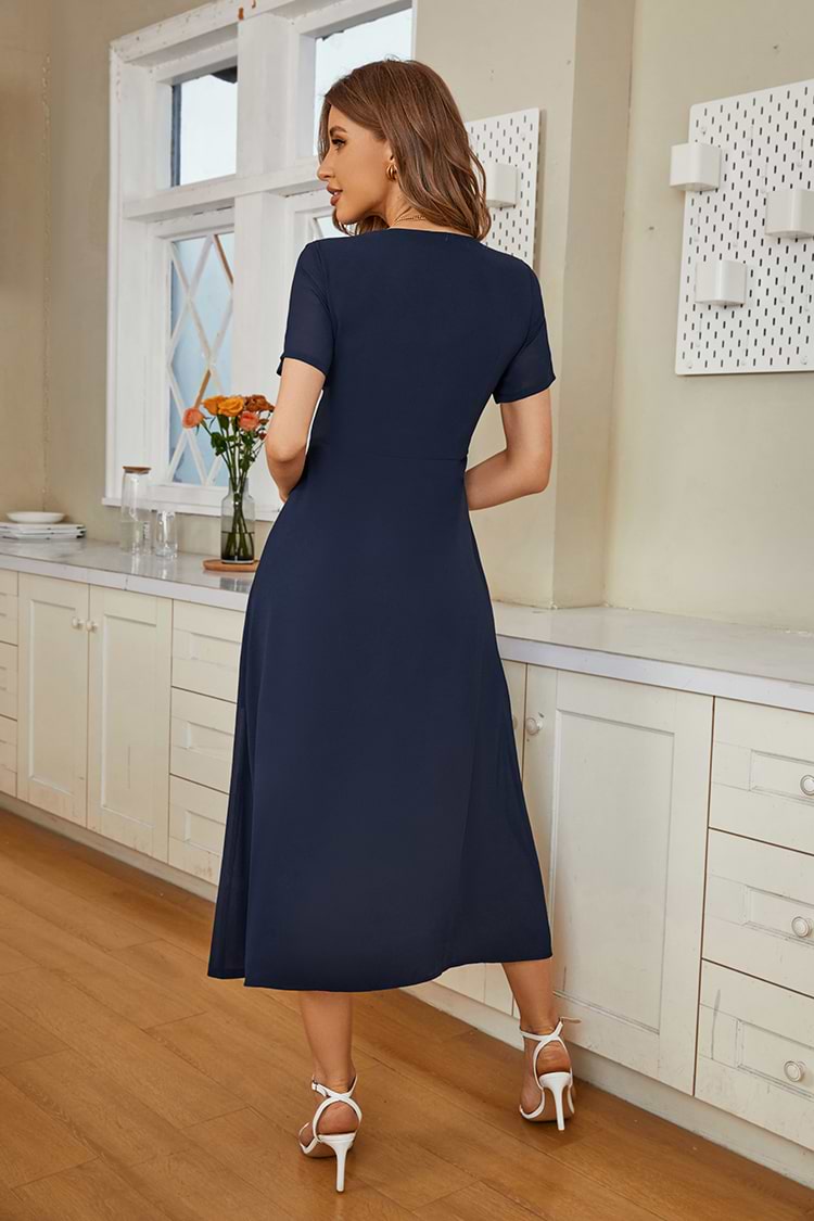 V-Ausschnitt Ruching geteiltes A-förmiges Kleid mit Reißverschluss