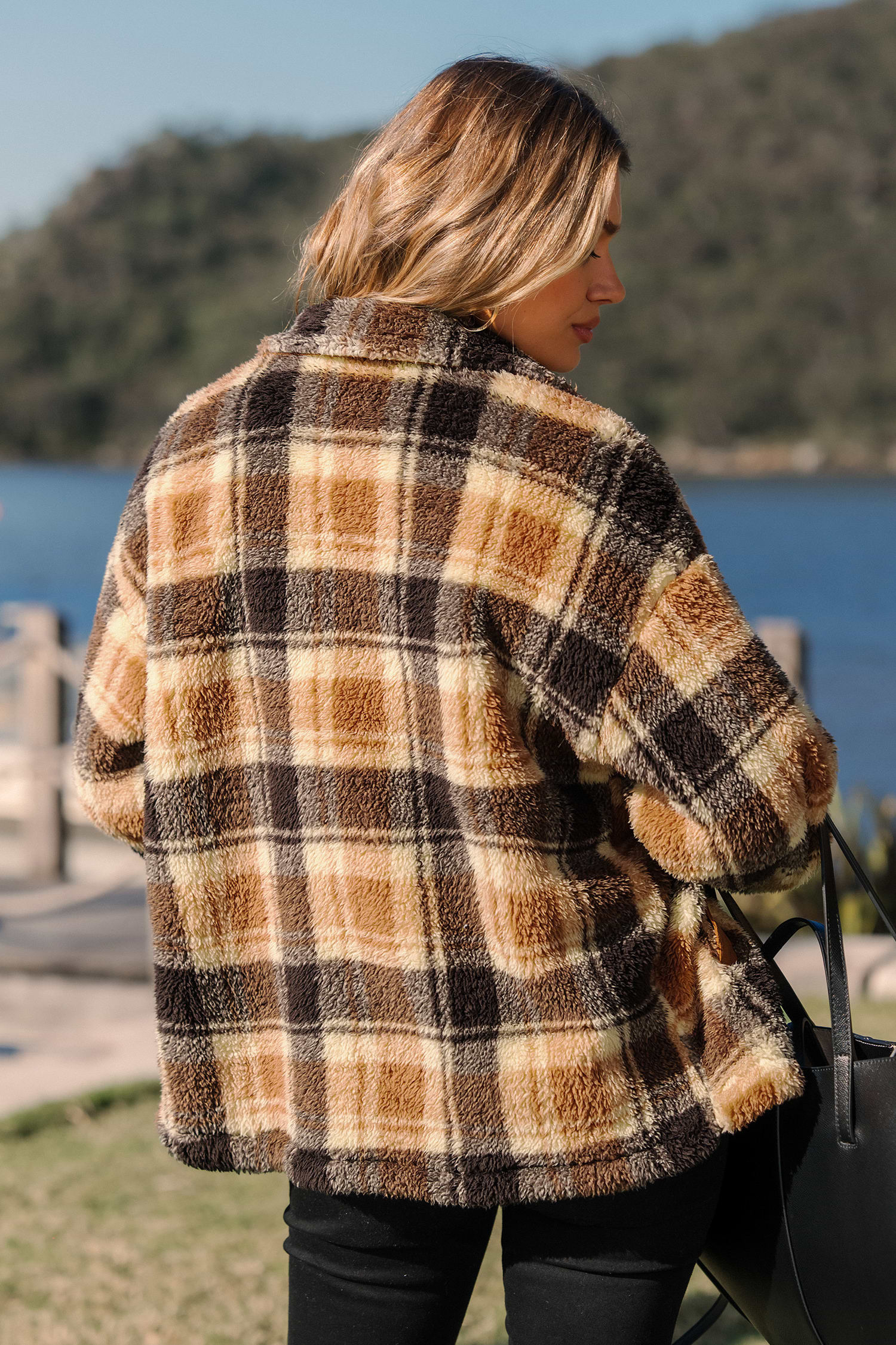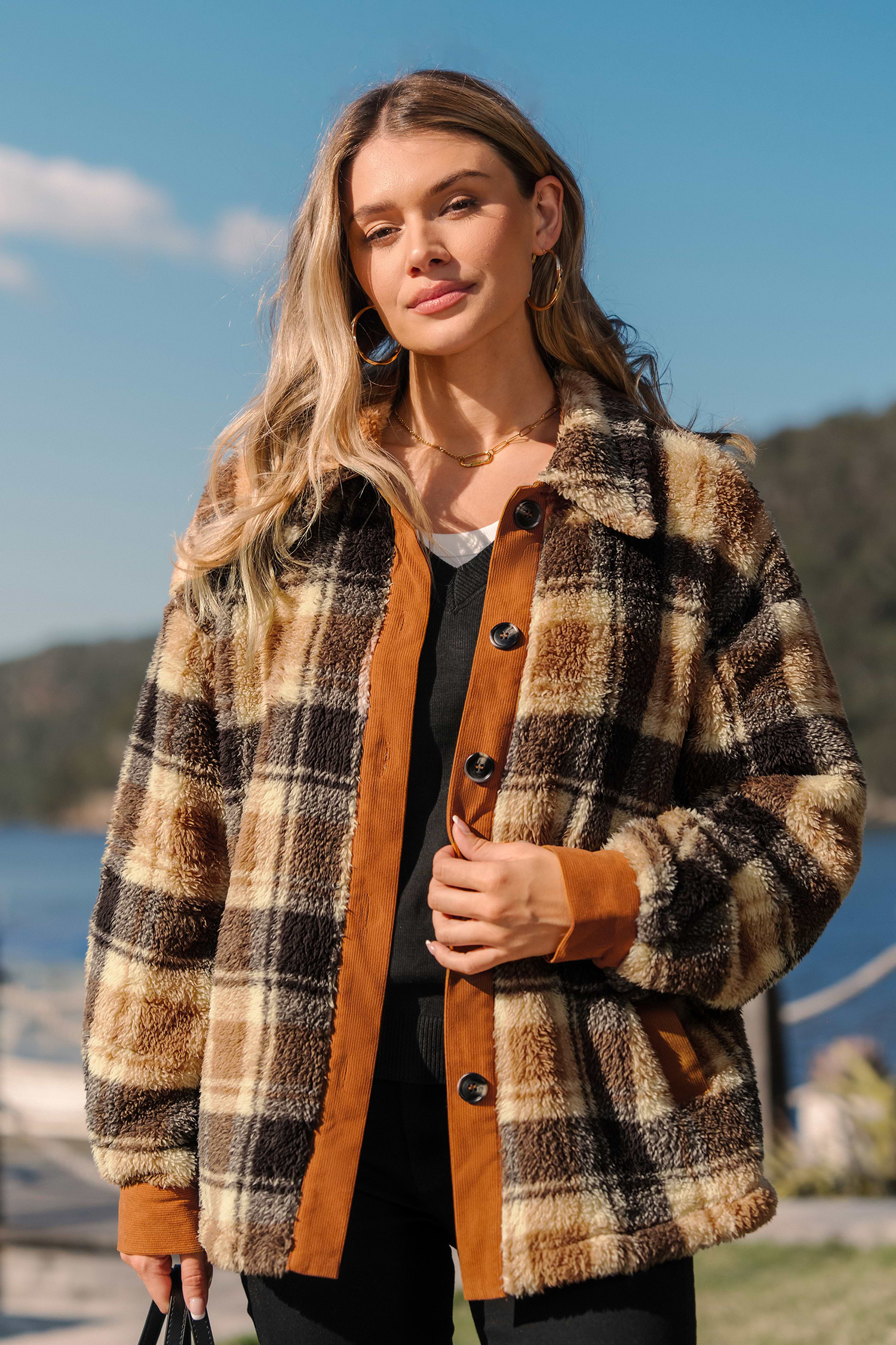 Der karierte Mantel ist gemütlich, fröhlich und perfekt für Lagenlooks an kühlen Tagen! Sein Kragenausschnitt, die langen Ärmel und die flauschige Textur sorgen für Komfort mit einem stilvollen, zeitlosen Karo-Look.